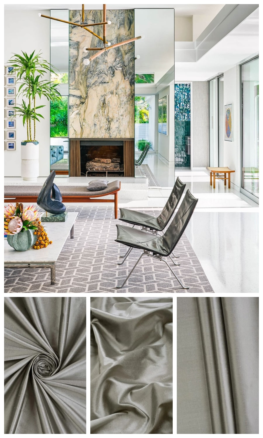 If steel were to take a silken avatar, it would surely be named Sombra. This pure silk drapery fabric has a silvery sheen reminiscent of regal ambience. It gives impeccable drape and looks fit for a palace. Its sombre color is the perfect backdrop for an elegant room where good taste reigns supreme.