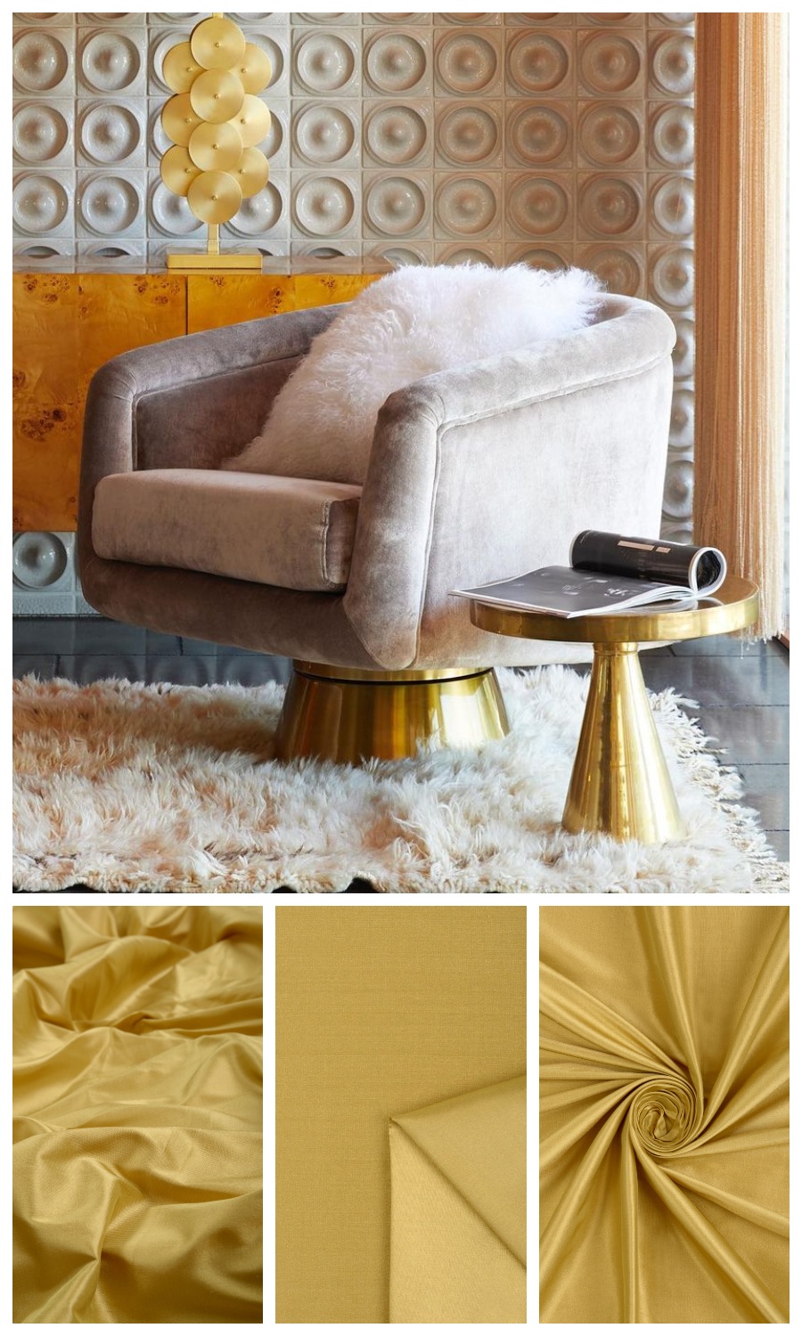 Pure silk in a gorgeous golden, ochre yellow color. A muted golden glow suffuses this exotic fabric that spreads into your space when used in draperies. Lustrous and lushly slubby, it enhances the feel of luxury in any interior. Its warm yet neutral color works well with several color palettes.