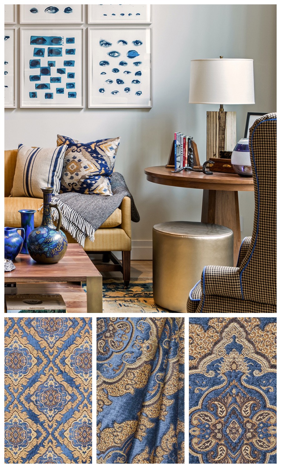 This extravagant jacquard fabric features an ornate pattern with floral and geometric elements in biscotti beige and umber brown on a rich navy blue backdrop. Its refined grace and velvety feel make this fabric fit for a palace.