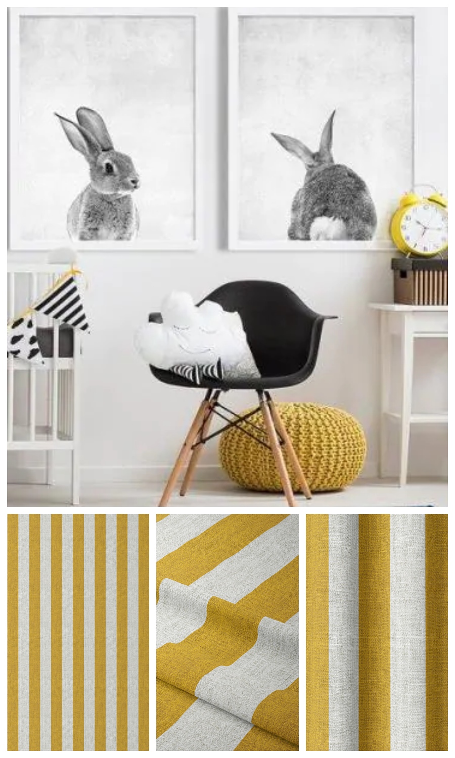 There’s nothing quite like a clean, minimalist stripe to modernize a room, and Spray of Leaves will bring a contemporary touch to even the most traditional of spaces. Featuring mustard yellow stripes on white, with a texturally rich base of herringbone weave, the fabric hangs beautifully as both curtains and shades, and gives an illusion of height when hung from the ceiling.