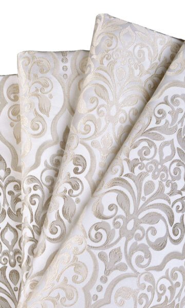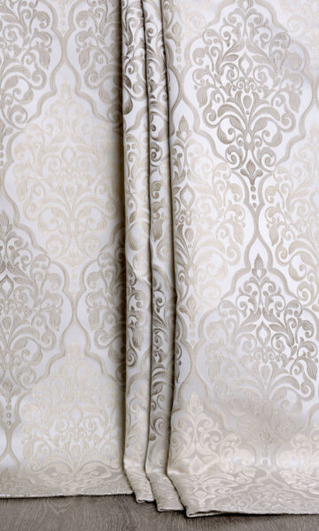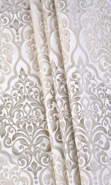If you are looking for a sumptuous fabric that whispers class and sophistication, check out this gorgeous self patterned damask in champagne beige. Its play of textures combined with a lovely vine and trellis motif is definitely a winner. We recommend pinched pleat style curtains to bring out the full glory of this fabric.