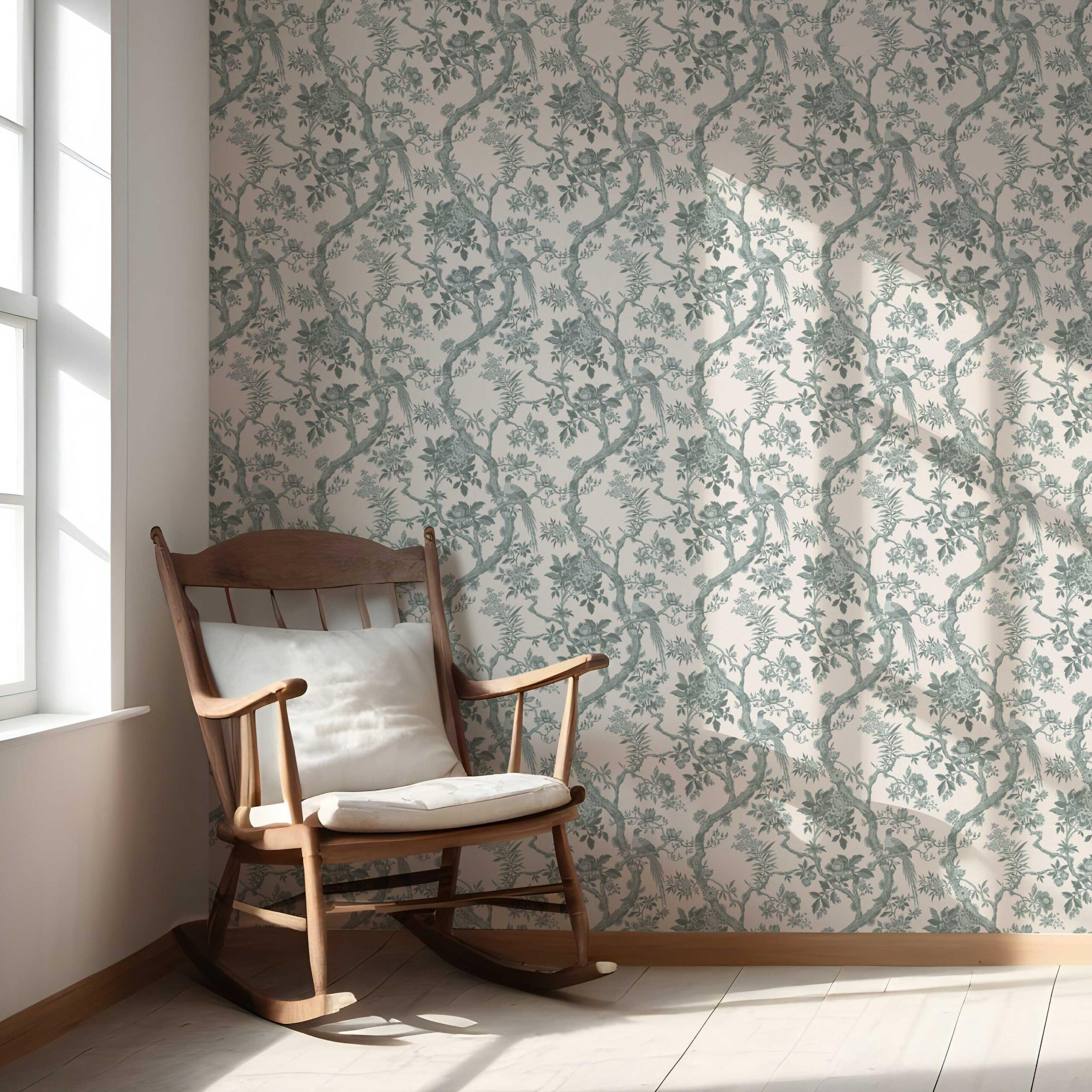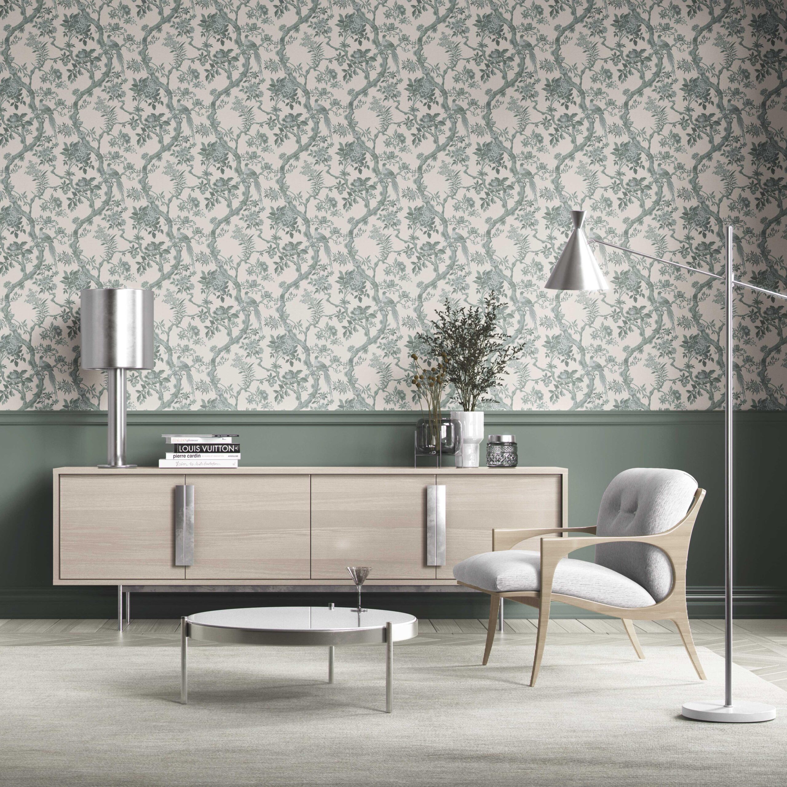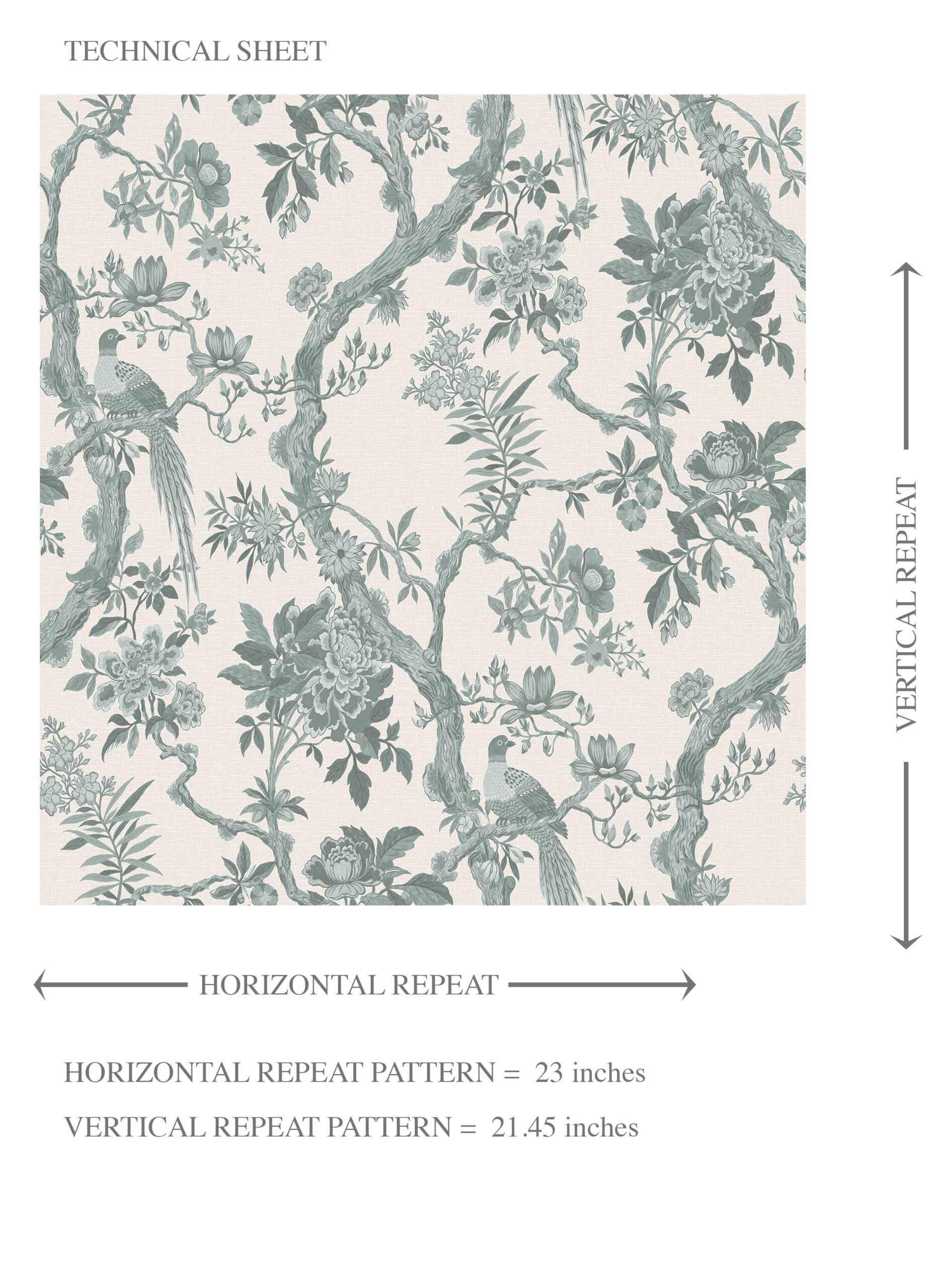 ‘Adrano’ Floral Toile/ Bird Print Chinoiserie Wallpaper (Gray-Green)