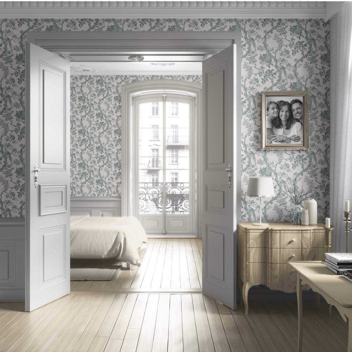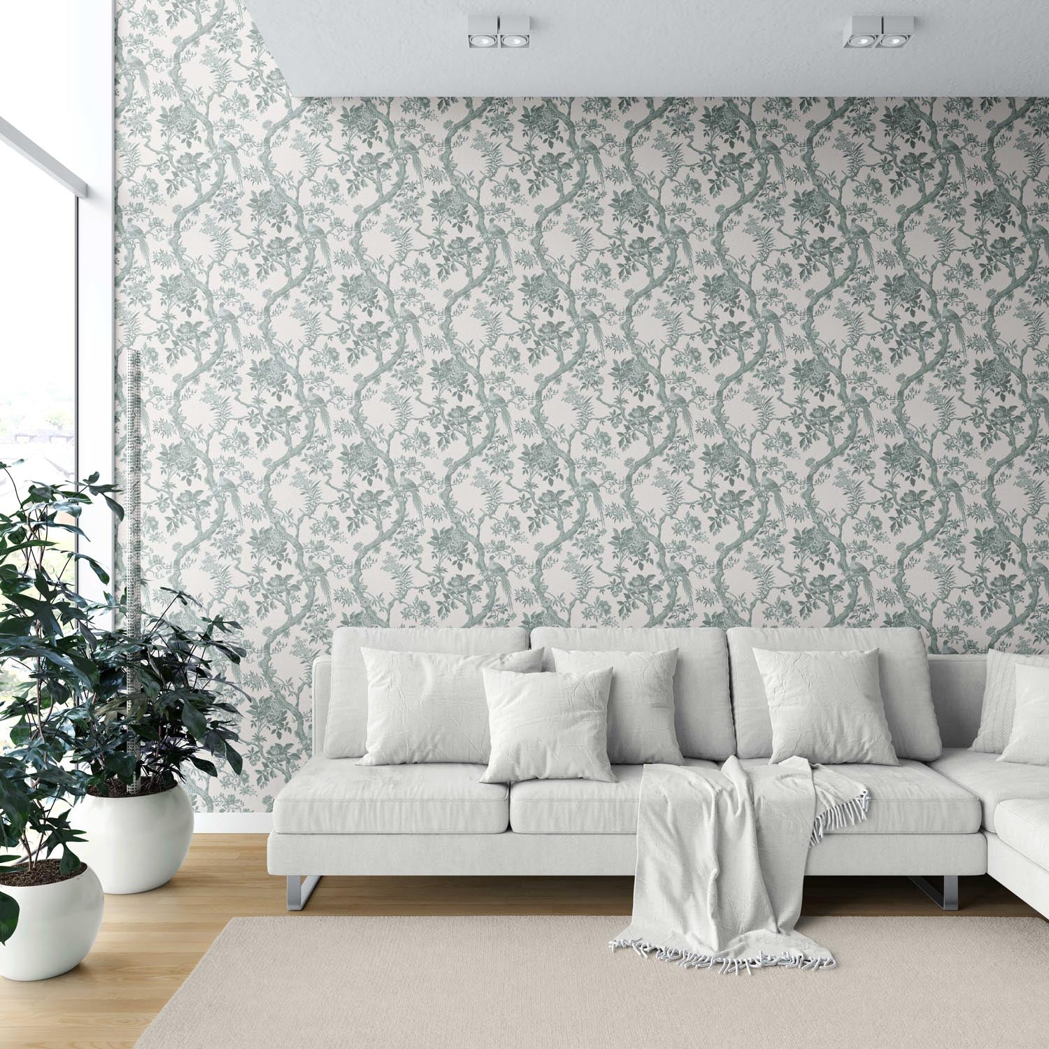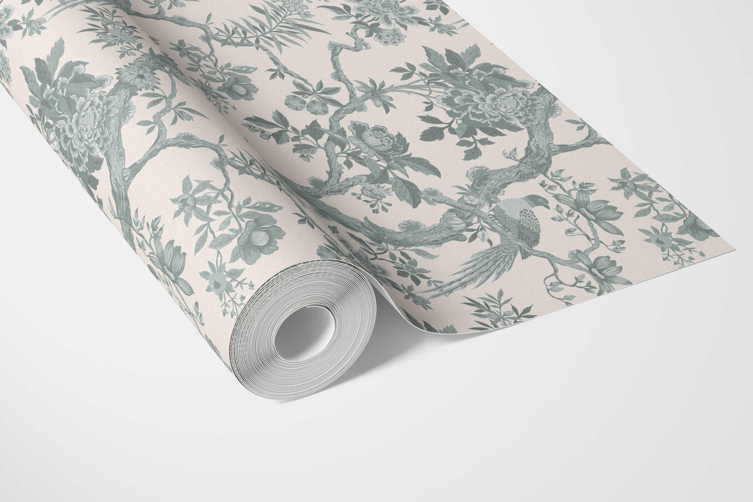 ‘Adrano’ Floral Toile/ Bird Print Chinoiserie Wallpaper (Gray-Green)