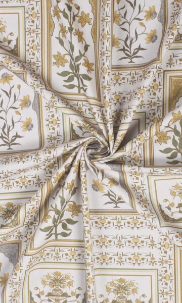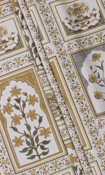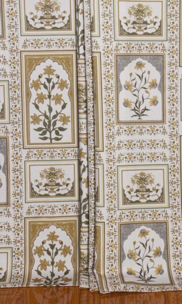 Oriental theme in a classic color scheme. Advika offers a sneak peek into India’s extravagantly detailed art forms and architectural marvels. It combines the florid beauty of Mughal-style hand-painted floral designs and intricately embellished ‘jharokhas’ – the ornate oriel windows of classical Indian architecture. Add an eclectic dimension to your decor with window treatments crafted from this exotic cotton fabric.