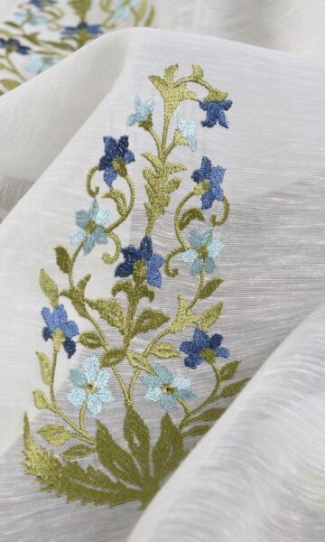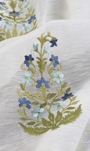 A showstopper paisley. Floral elegance in graceful colors and nimble embroidery merge with paisley to make a jaw-dropping feat. Ajrakh will veritably steal the show, not with fanfare and hullabaloo, but with a soft whisper, a gentle breeze, a silent gaze! Pair with solid blue drapery in a dreamy bedroom or let it shine alone on a sunny patio door – this diva will set the stage ablaze.