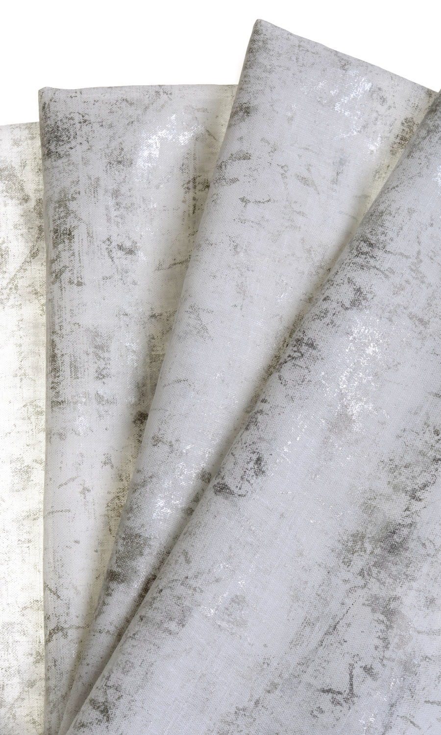 Poetically, could be called moonlit snow. It is a sheer drapery fabric with its vast white expanse highlighted with silver metallic color in tissue paint finish. Good for standalone draperies as well as for mixing and matching with complementary drapery fabrics.