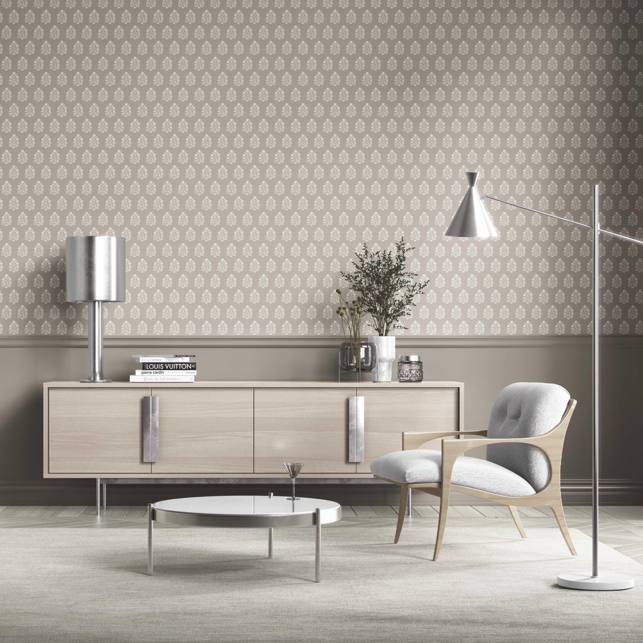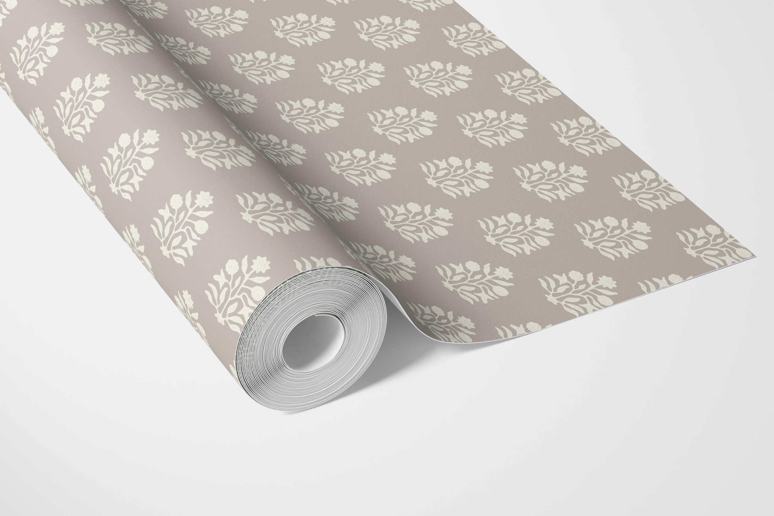 ‘Alistair’ Neutral Botanical/ Floral Block Print Wallpaper (Gray/ Greige/ Cream)