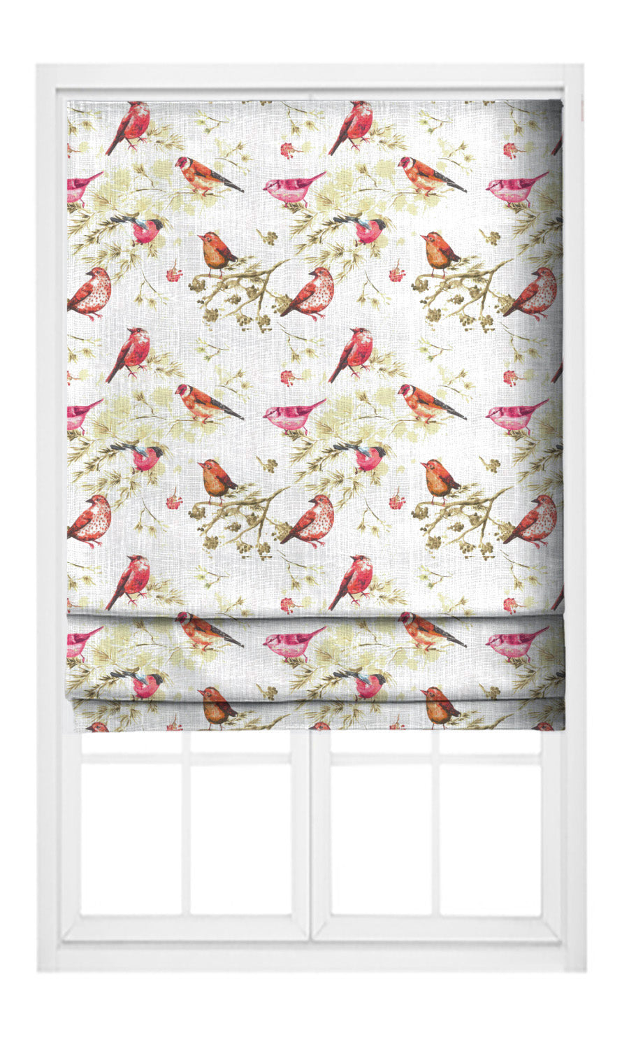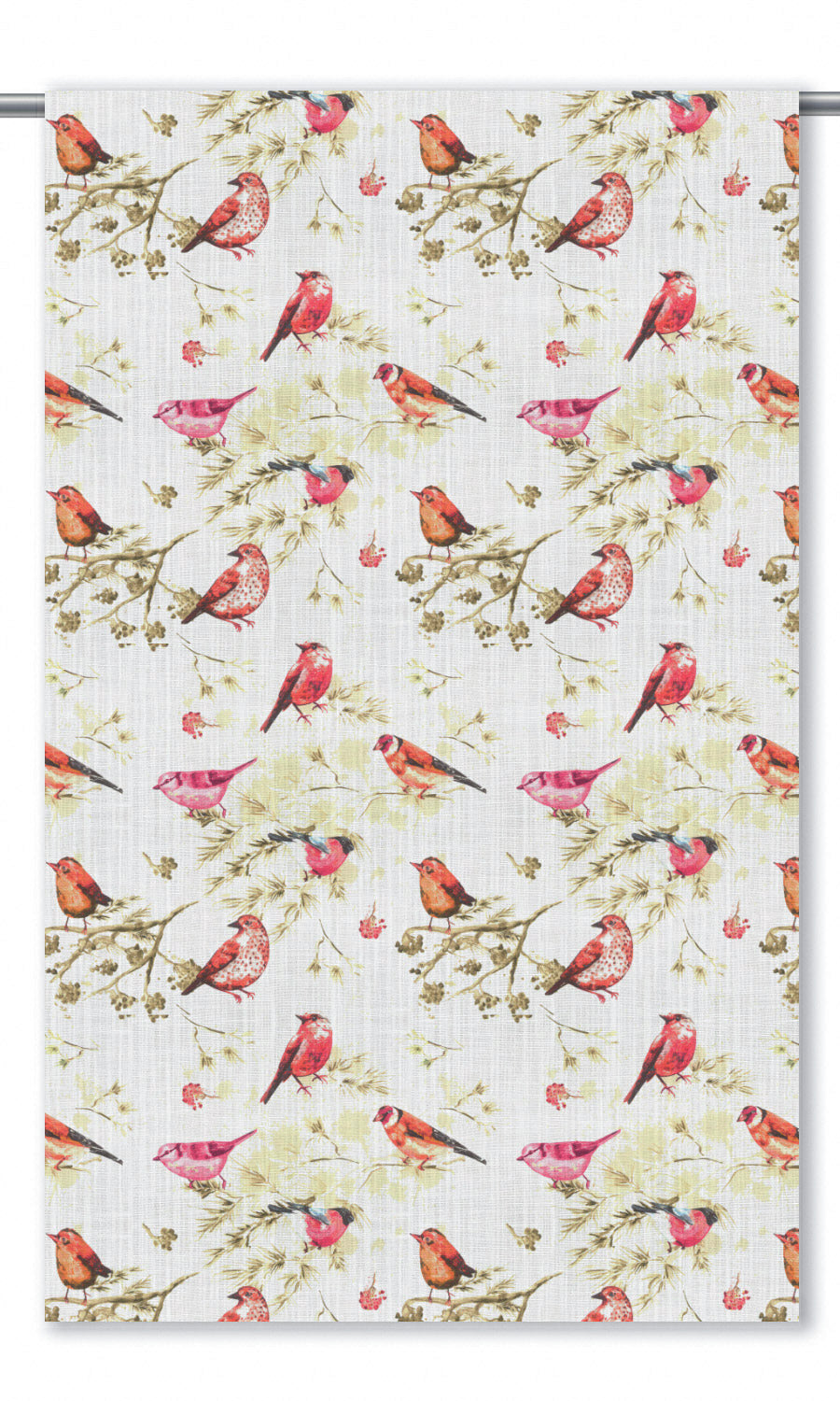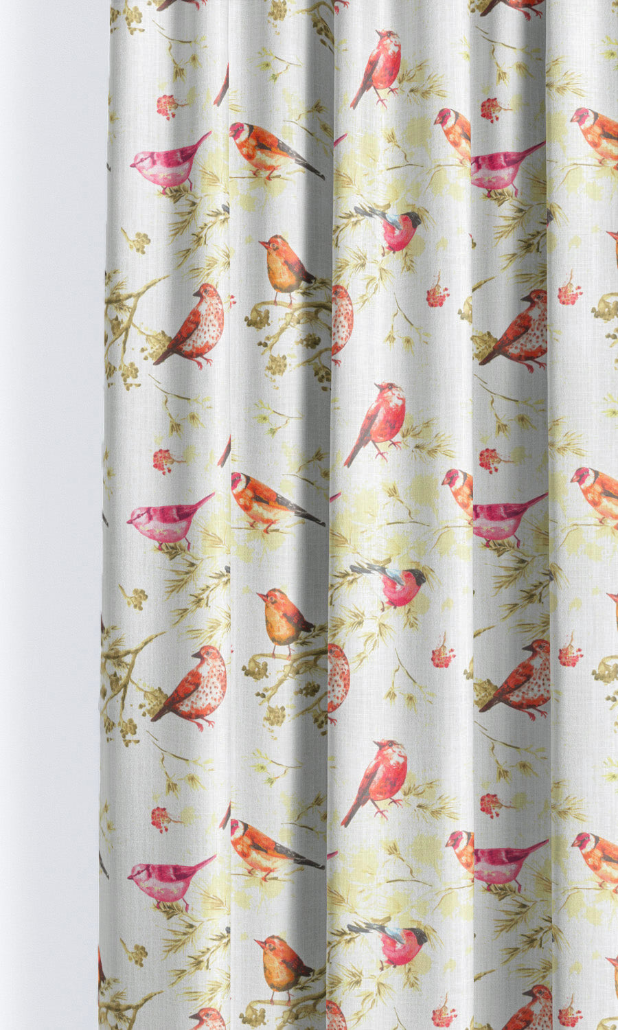 This pretty fabric features a lovely nature print with lark birds, flowers and foliage motifs on a tonal ivory and beige backdrop. A vibrant color palette with oranges, pinks and browns enlivens any space. A charming choice for an informal space