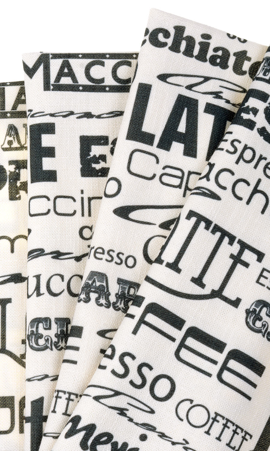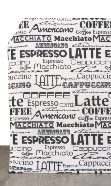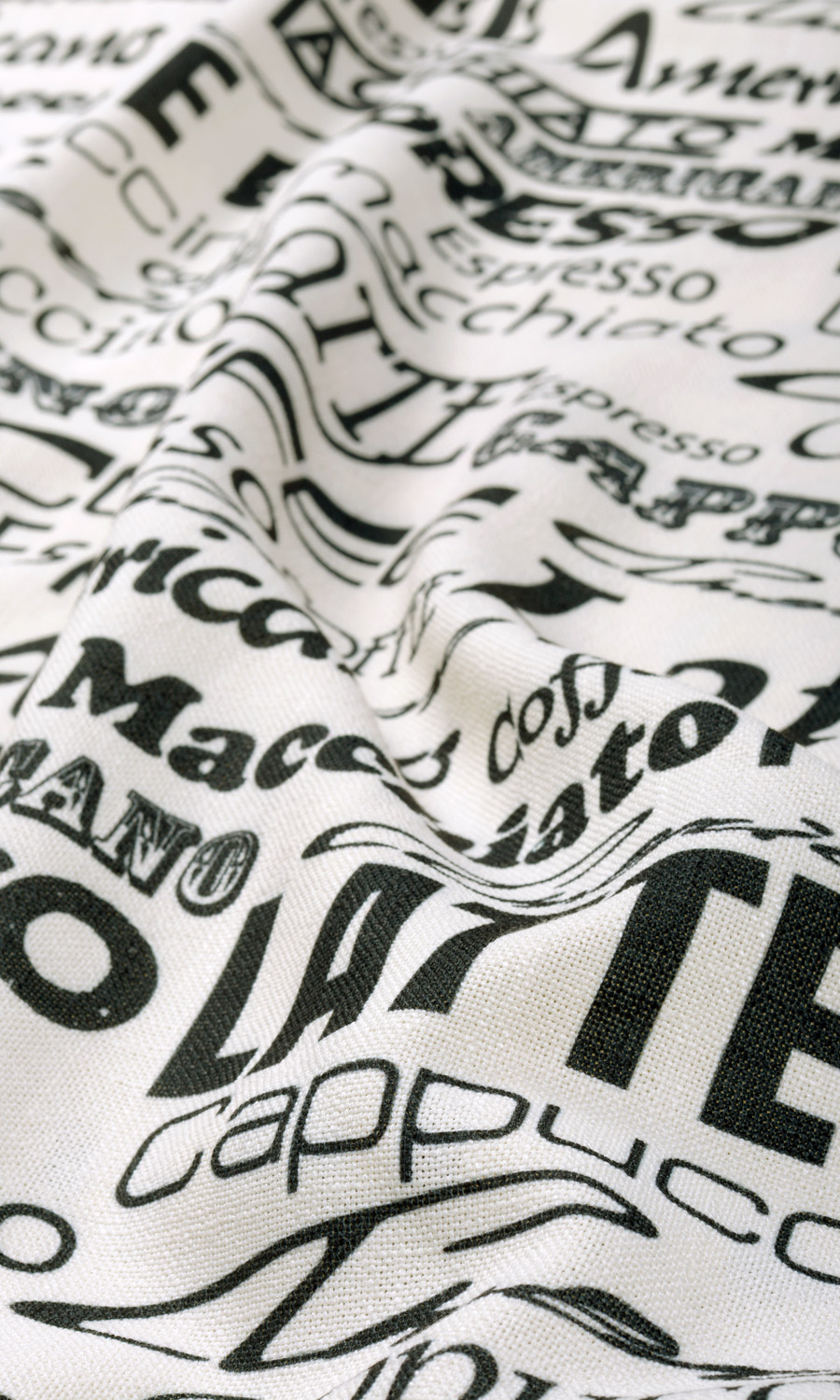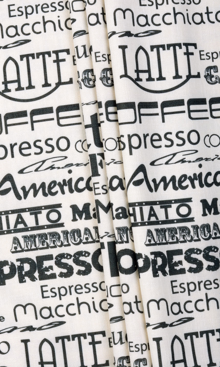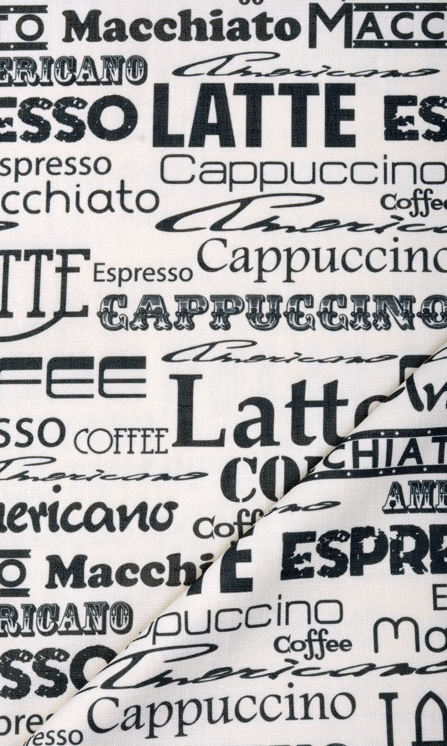 Wake up and smell the coffee with this cozy fabric! Featuring cute text print, Ambrette has names of coffees splashed across in black on a white base. From Americano to Macchiato, Espresso to Latte, the names have been printed in a mix of vintage and contemporary fonts. Just perfect for caffeine lovers!
