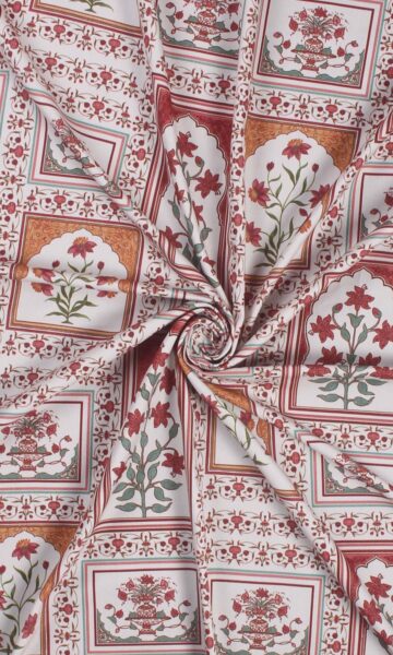 Bring home a piece of the royal palaces of India! This 100% cotton fabric teems with oriental themes of Mughal floral motifs and ‘jharokhas’ – the ornate oriel windows of classical Indian architecture. Inspired by the ancient art forms of the golden Thar desert, window dressings in this one-of-a-kind fabric will beautifully accentuate the eclectic bent of your maximalist or bohemian home.