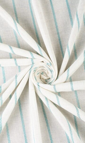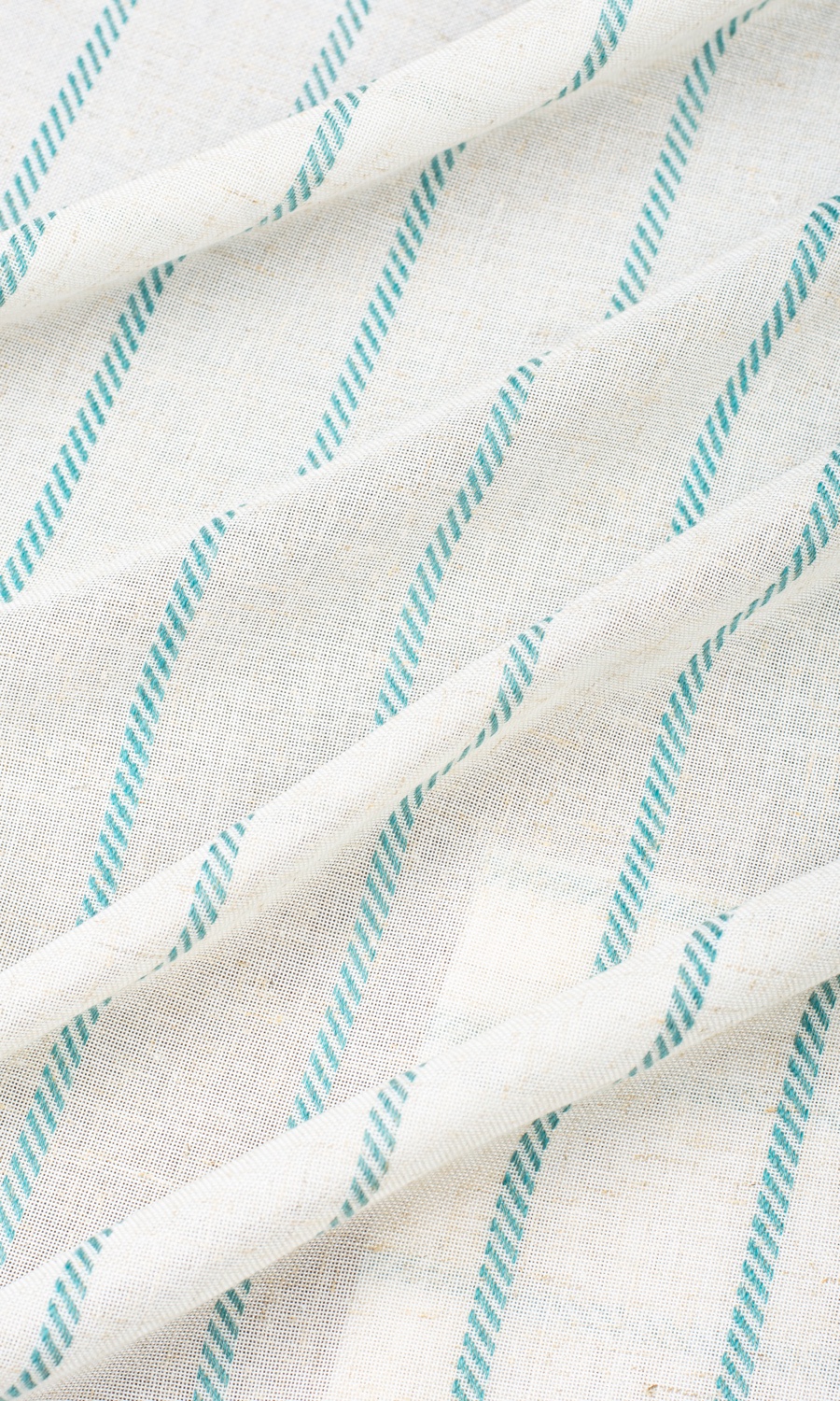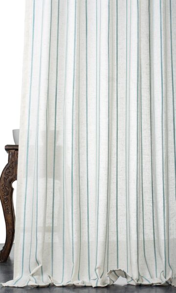 A lovely warm white linen sheer that offers a one-of-its-kind elegance with its turquoise blue stripes. Slight indulgence in color and pattern and a ton of slubbed texture proffer a rich personality while keeping to a minimal appeal. Dress a coastal home, a nautical-themed kitchen or even a modern home that loves a splash of color with casual charm while being assured of a wrinkle-free sleek aesthetic by the lasting partnership of linen and polyester.