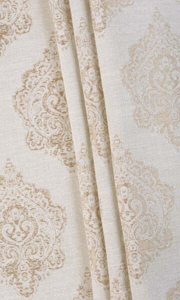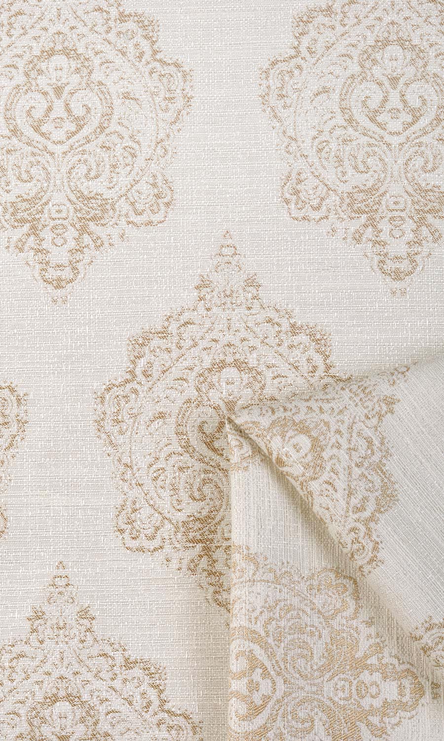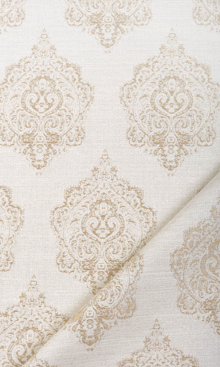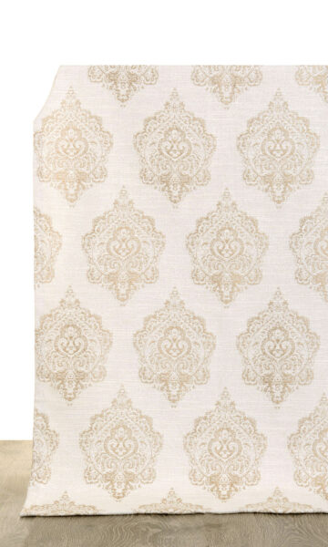 If you like traditional jacquard motifs but dislike intense color palettes and overly ornate design elements, Auga should appeal to you. This sturdy polycot drapery fabric has an off-white base patterned with a traditional, oversized and stylized botanical motif in pale brown. The texturally rich base and the raised pattern look good together; as does the simple no-fuss color combination.