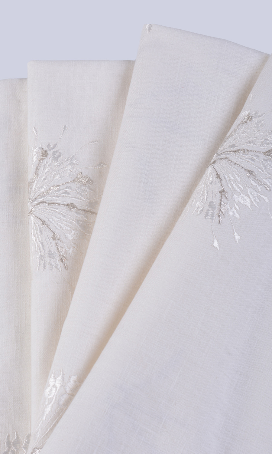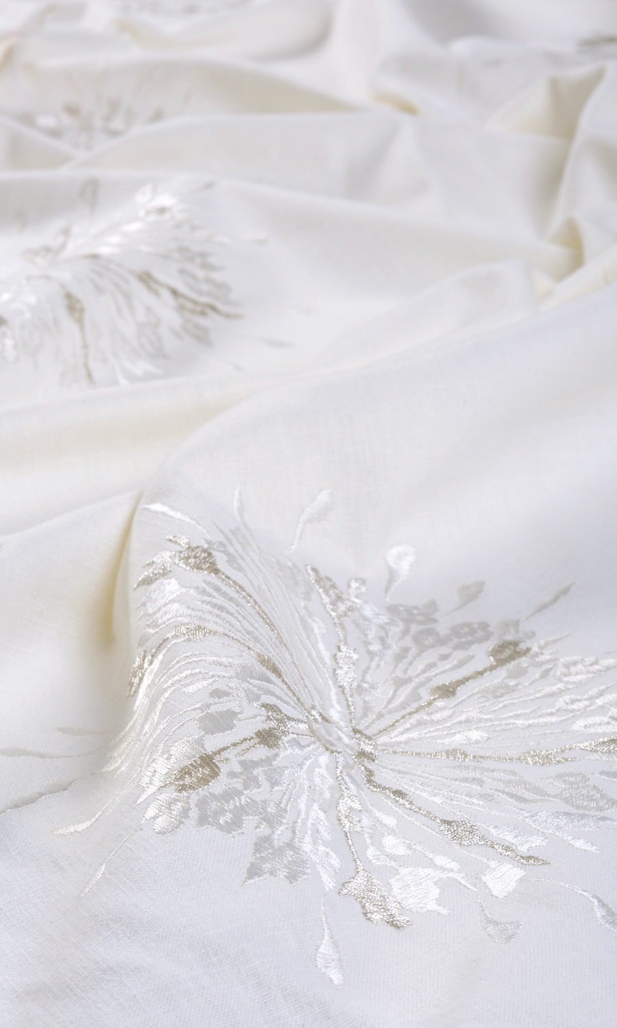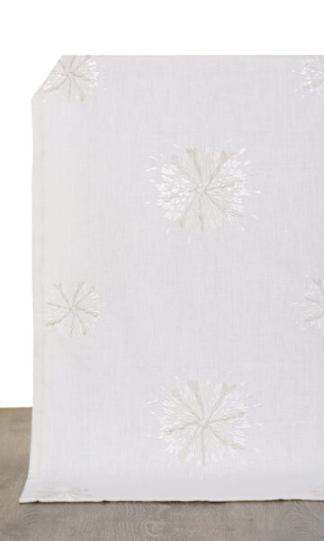 This white fabric is embellished with scattered sunburst motifs embroidered in pale and silvery grays. The look is refined, the impact is sophisticated. As an added plus, the base fabric is a blend of cotton, polyester and viscose, to give smooth finish and flawless drape.