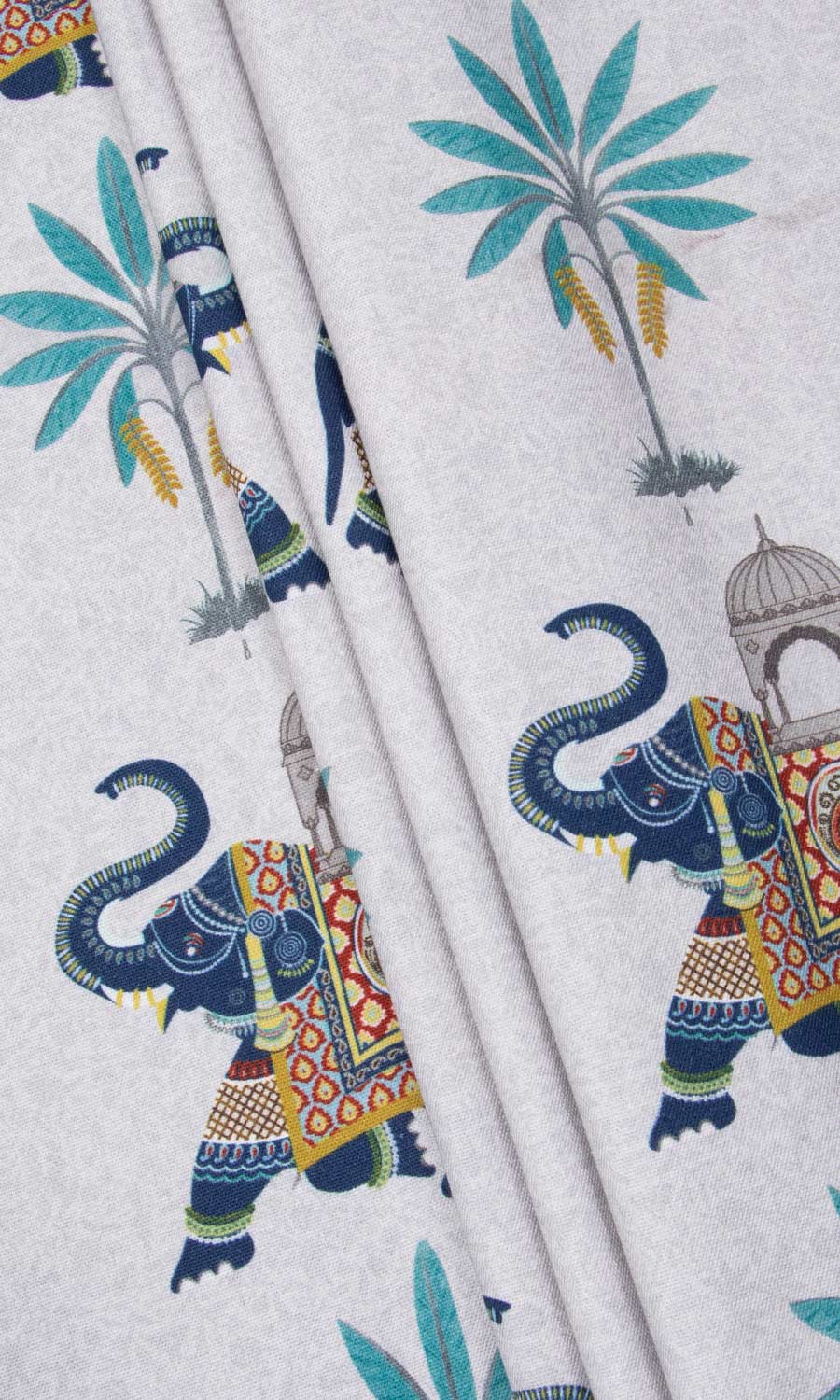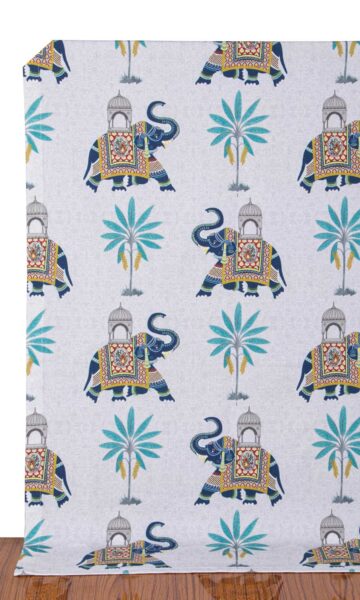 Pure cotton fabric with oriental themes and heartwarming colors. Plantain trees laden with fruit and elephants with ornate howdahs offer a throwback to Eastern symbols of prosperity. Enliven a traditional, maximalist or eclectic space with the exotic flavor and attractive hues of Baran.