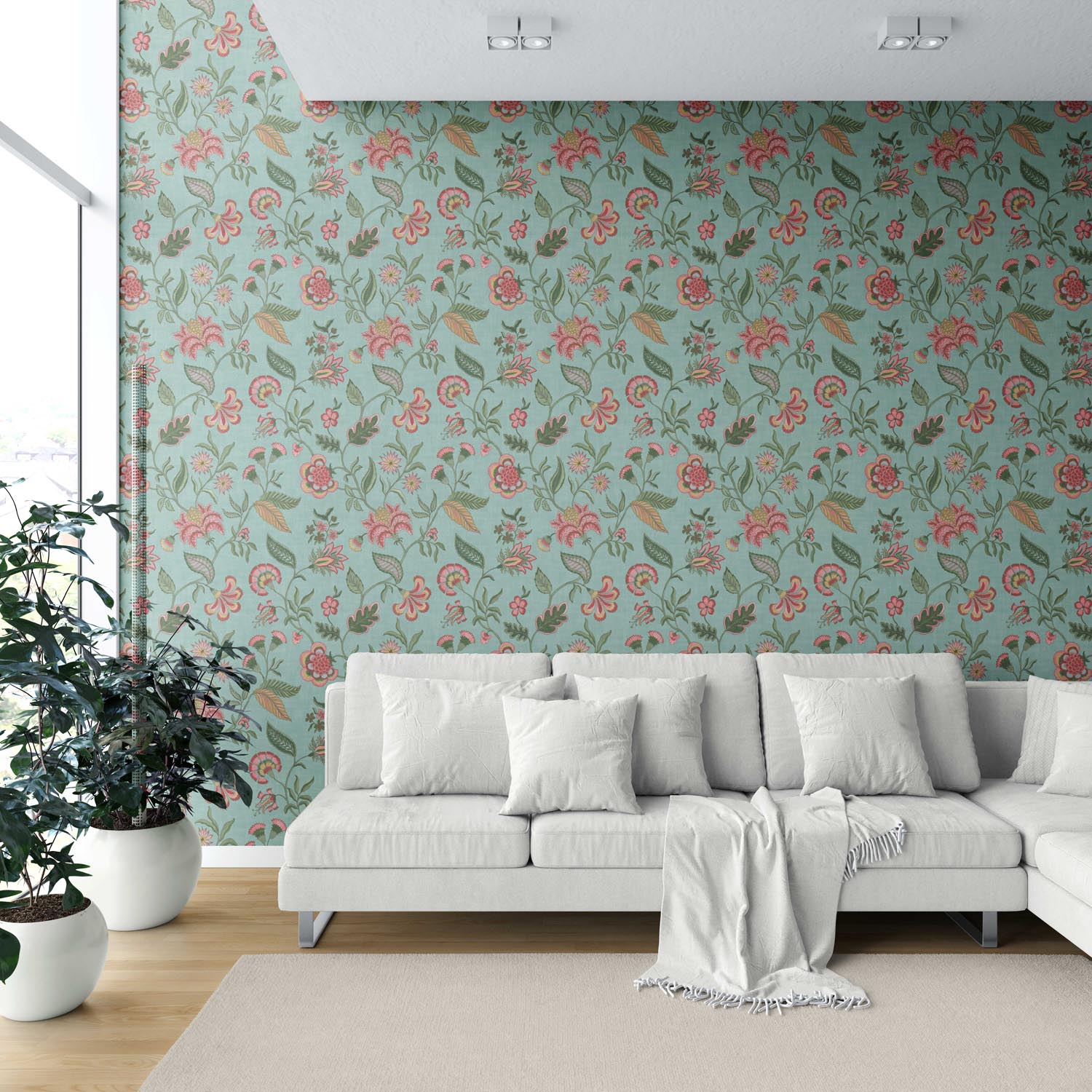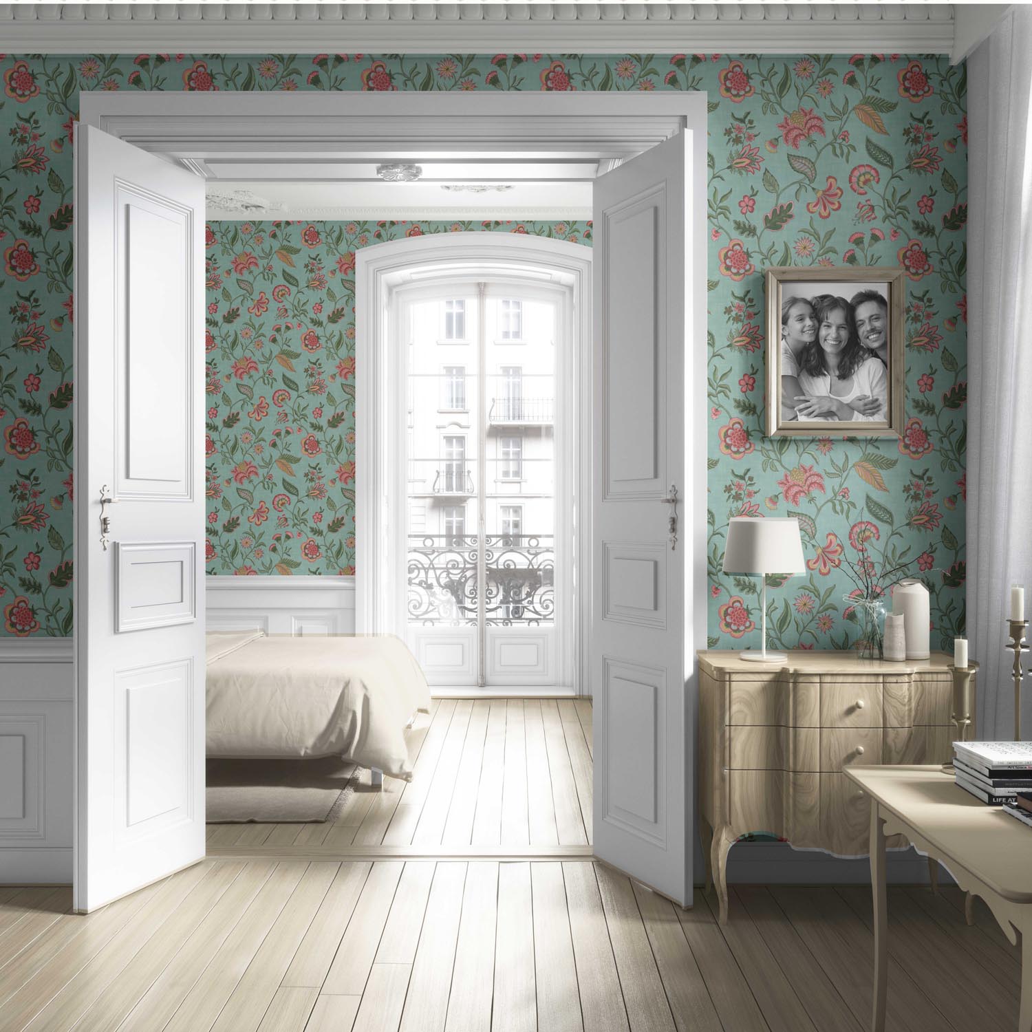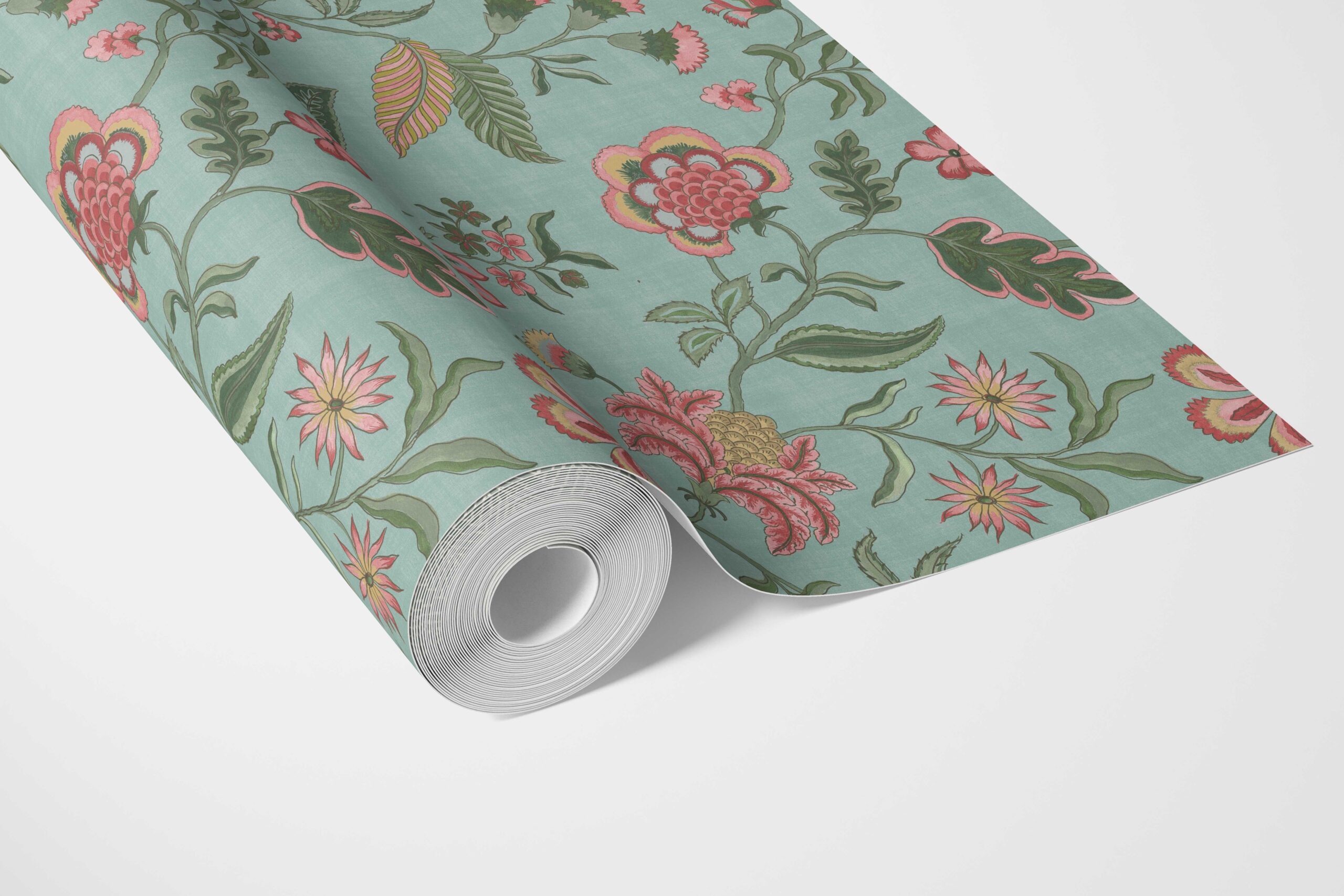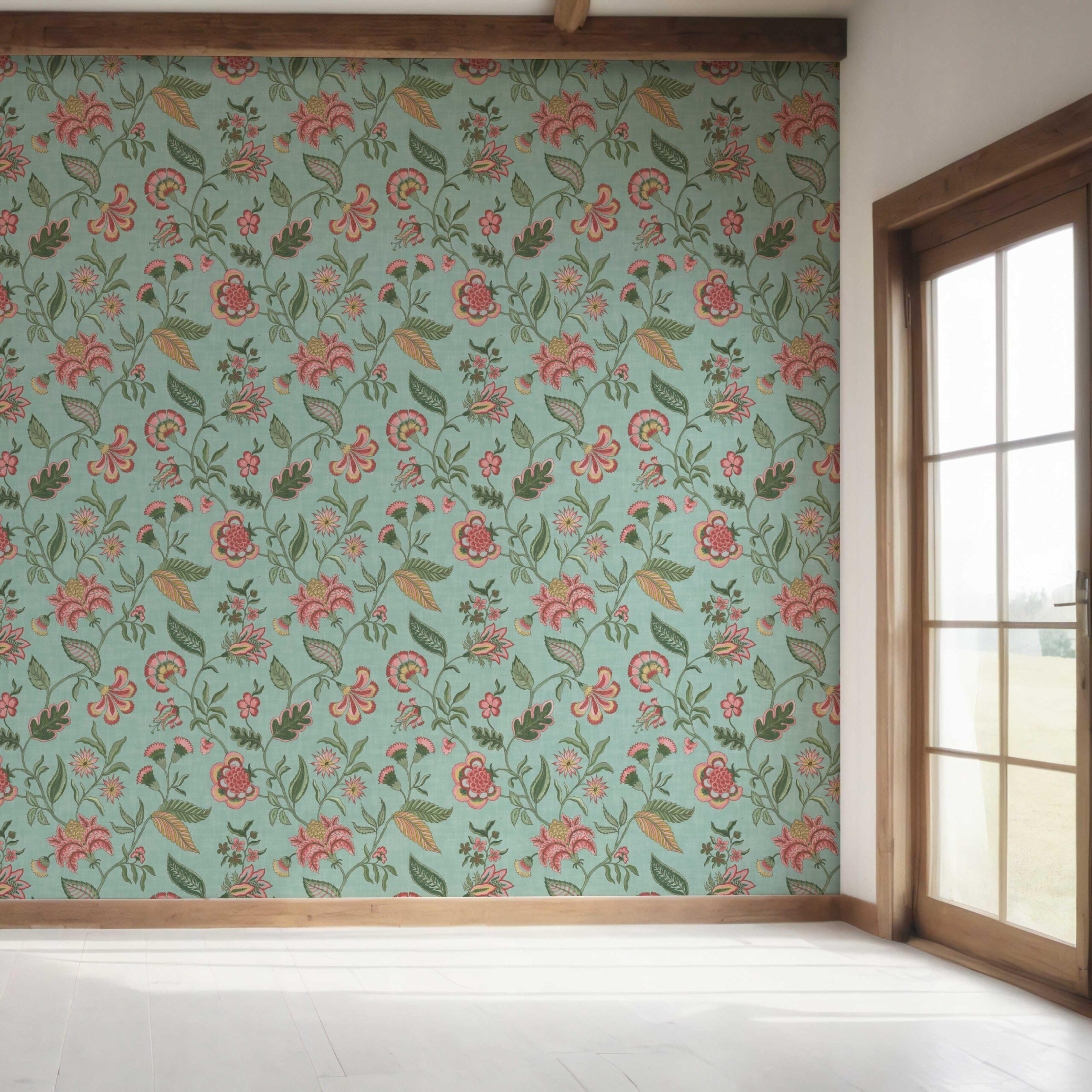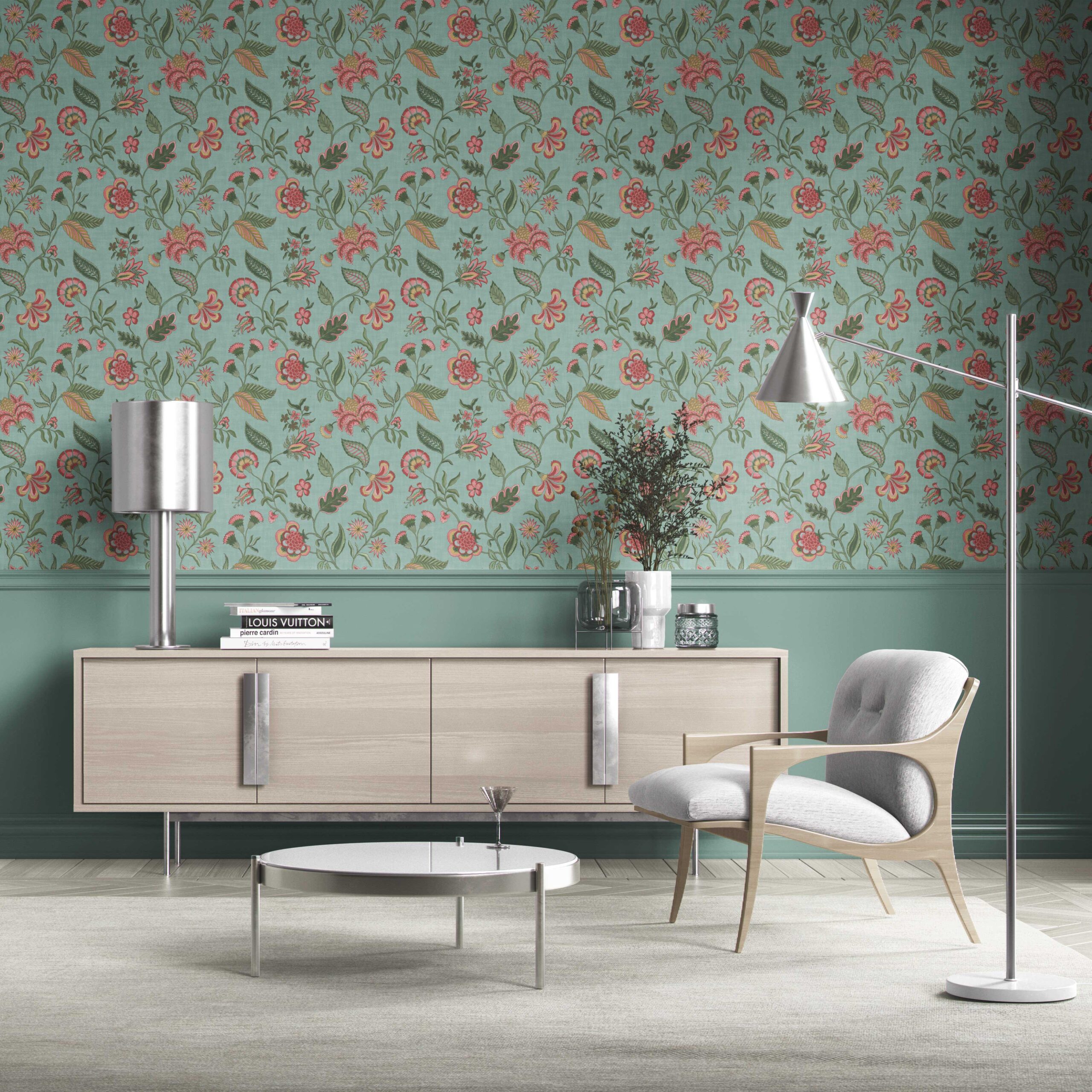 ‘Barona’ Botanical/ Floral Chinoiserie Wallpaper (Blue-Green/ Pink/ Red)