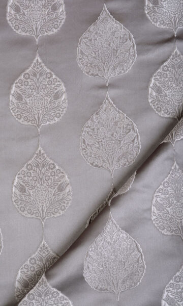 If conventional floral draperies look just too common and geometric weaves leave you unimpressed, may we suggest Baski? This pale gray woven fabric features a peepul leaf motif set in ogee style where rows of leaves create columns of curving arcs throughout. Each leaf is inset with intricate floral details as a decorative touch.
