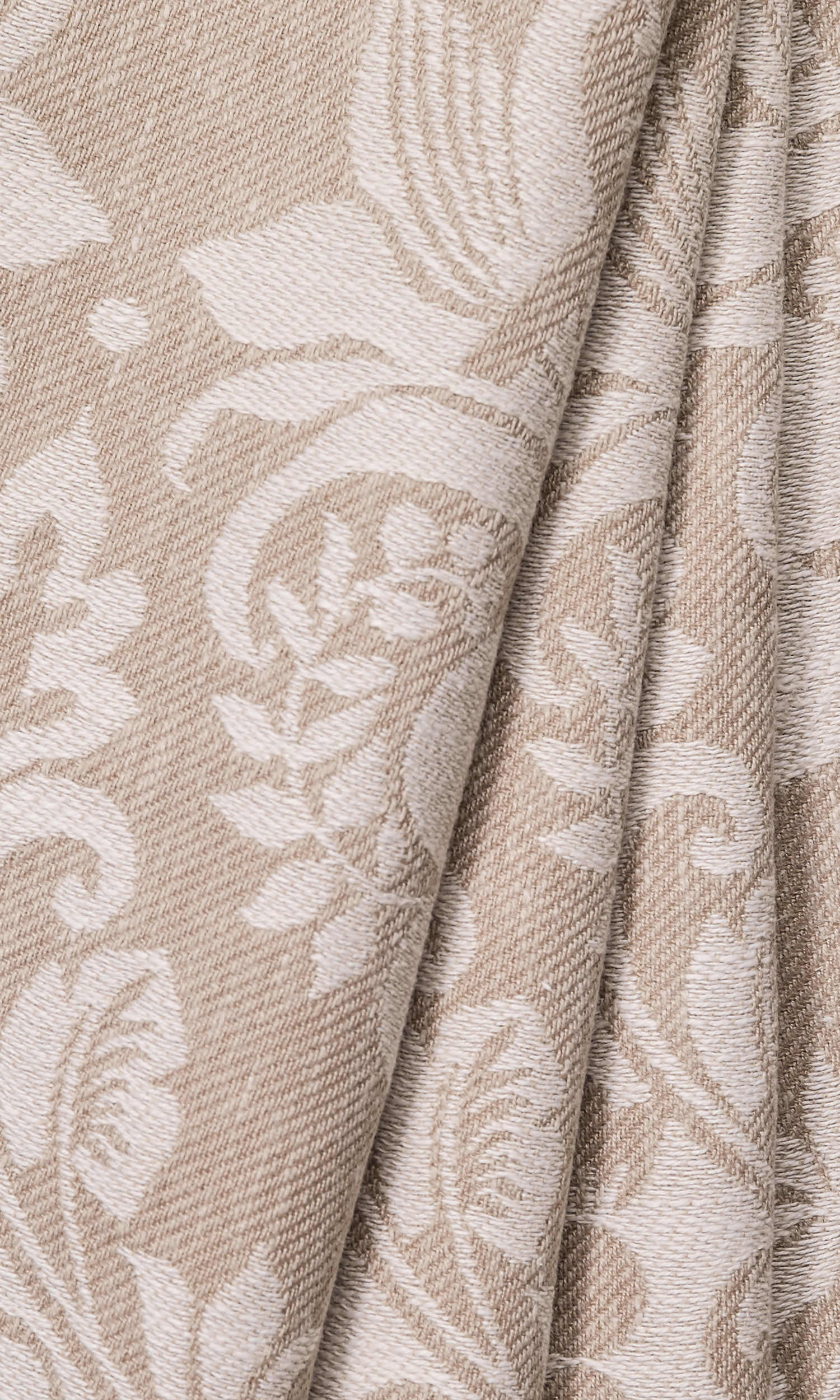 If you want a drape that has vintage charm with modern sensibilities, take a look at this fabric. Its twill woven base and pure white on sepia beige color scheme comes with a beautiful stylized foliage motif. While this fabulous fabric works well across decor style, our stylists recommend it especially for vintage and bohemian rooms. This fabric looks extra graceful in pinched pleats curtains.
