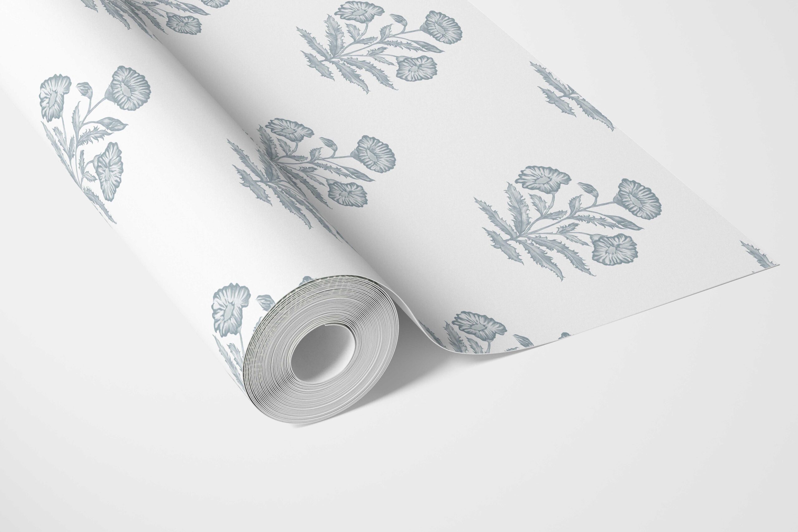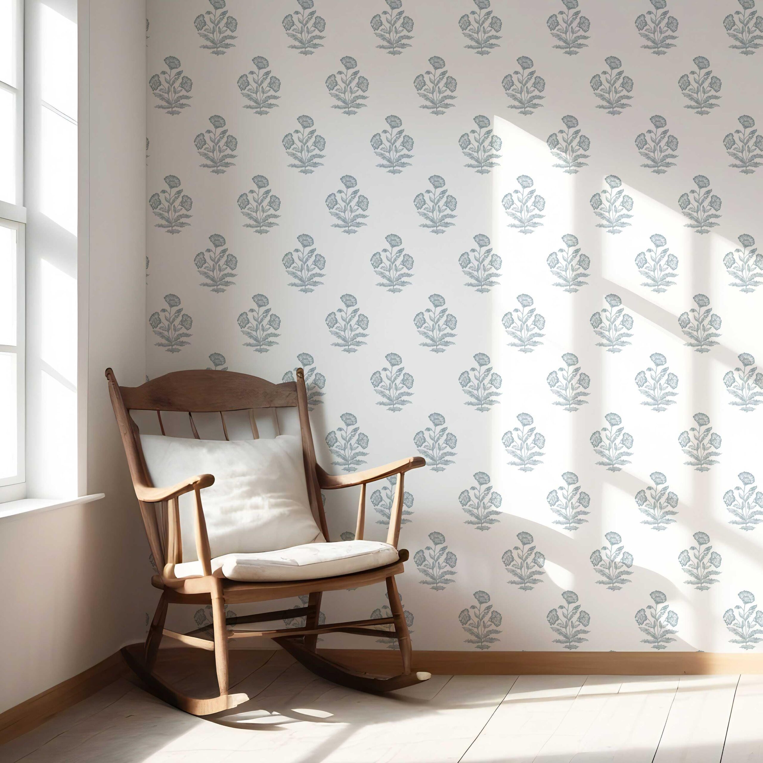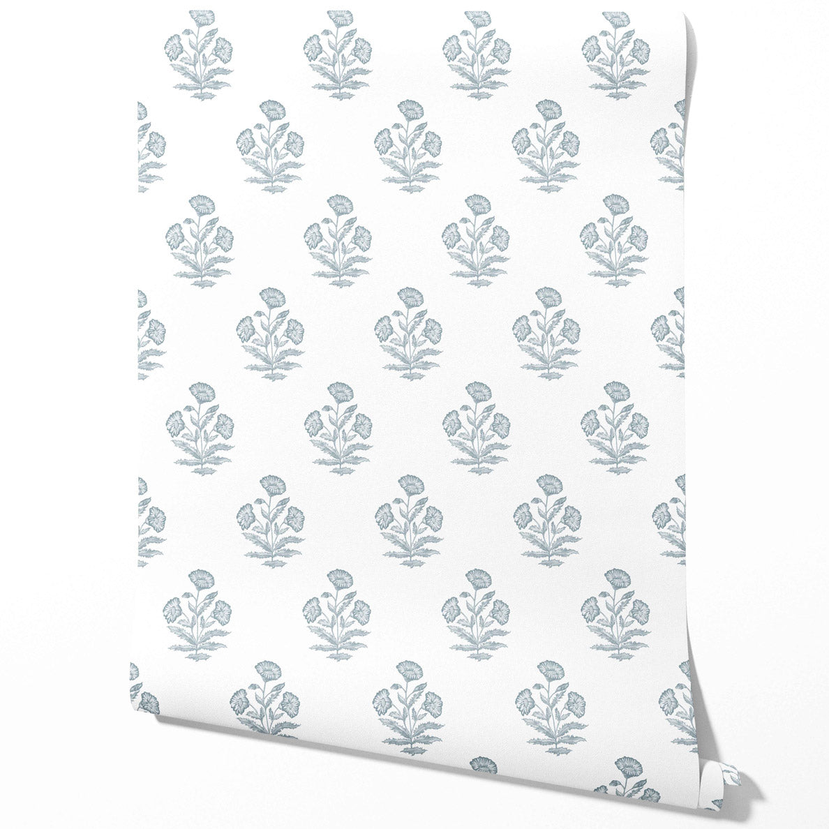 ‘Bernon’ Floral Block Print Wallpaper (Sage Blue/ White)