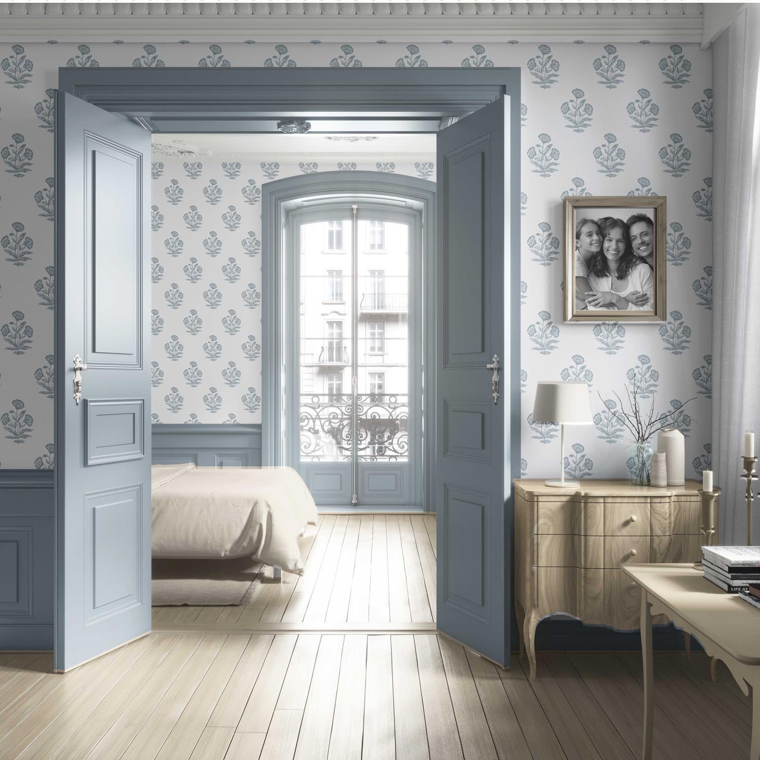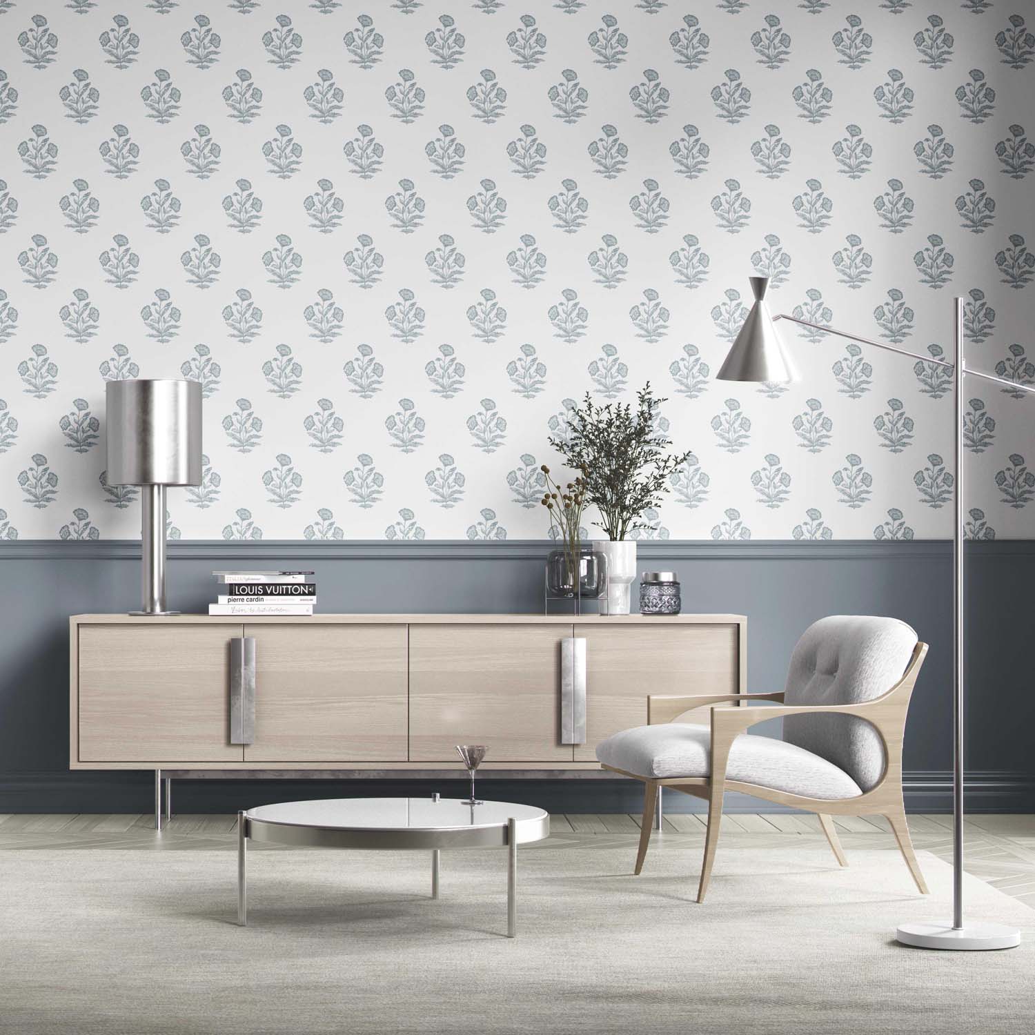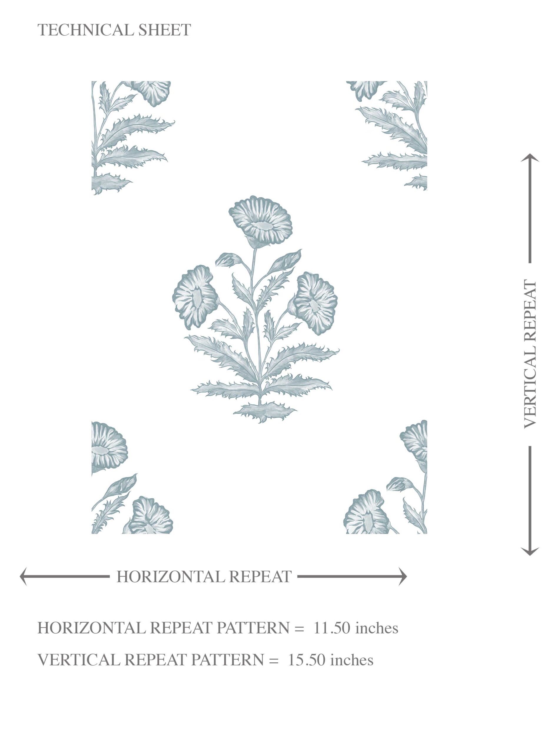 ‘Bernon’ Floral Block Print Wallpaper (Sage Blue/ White)