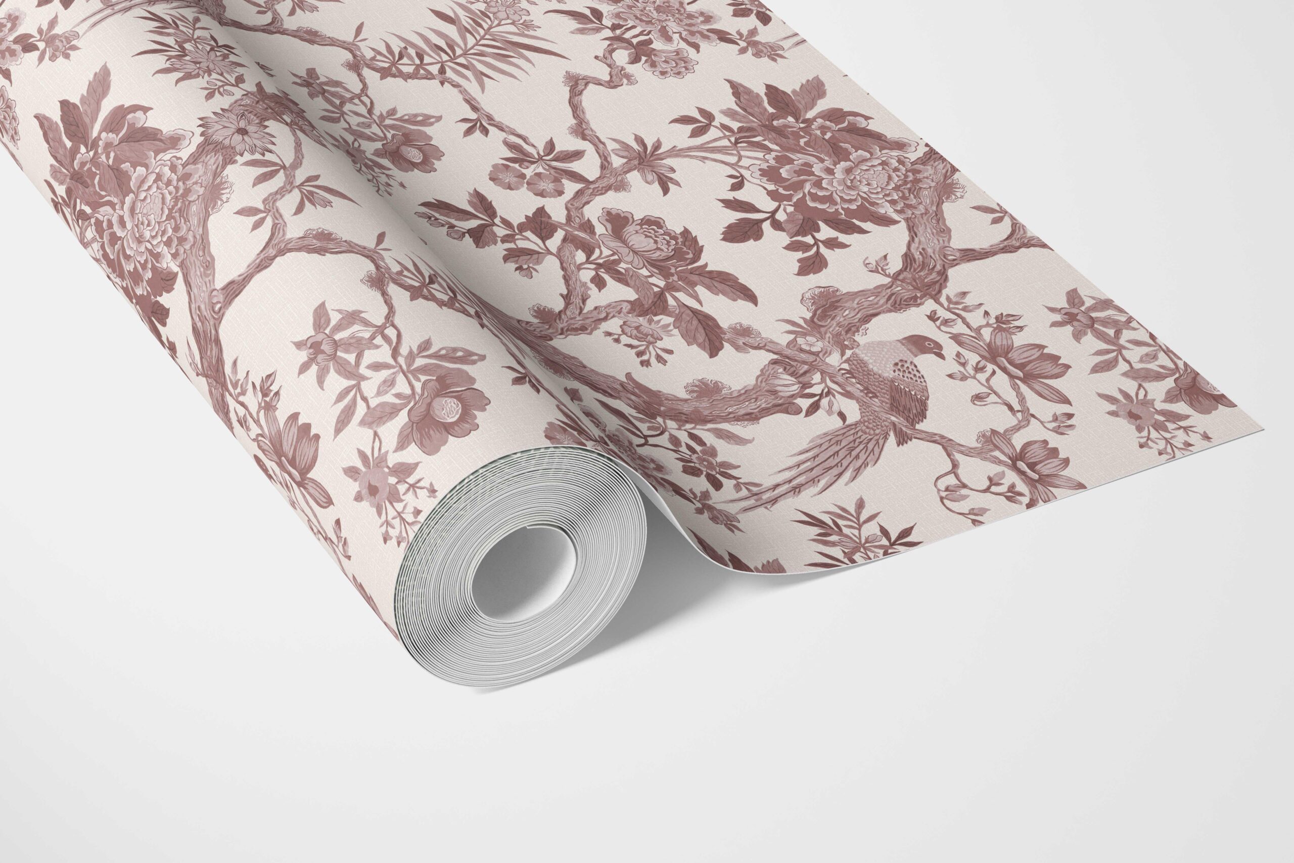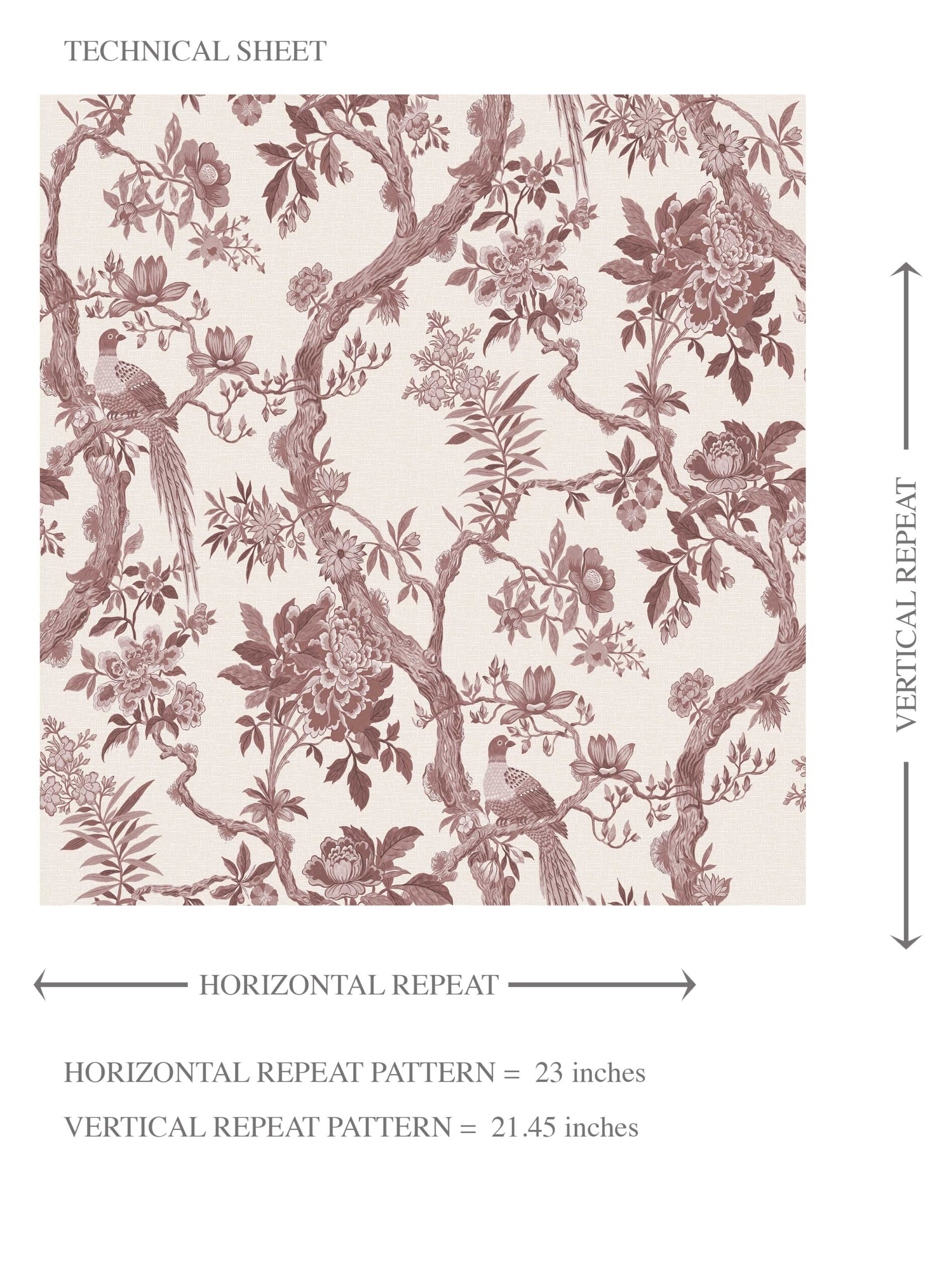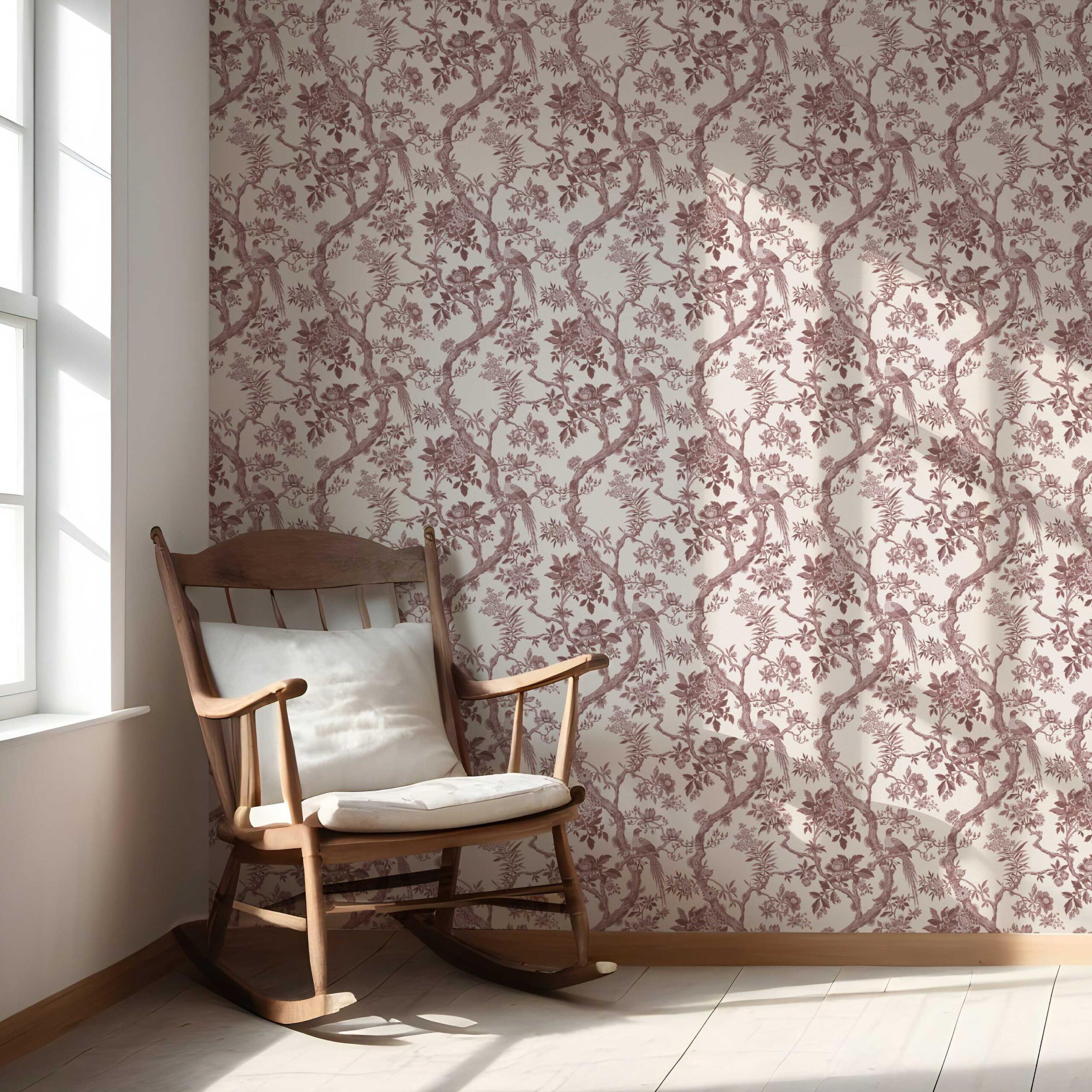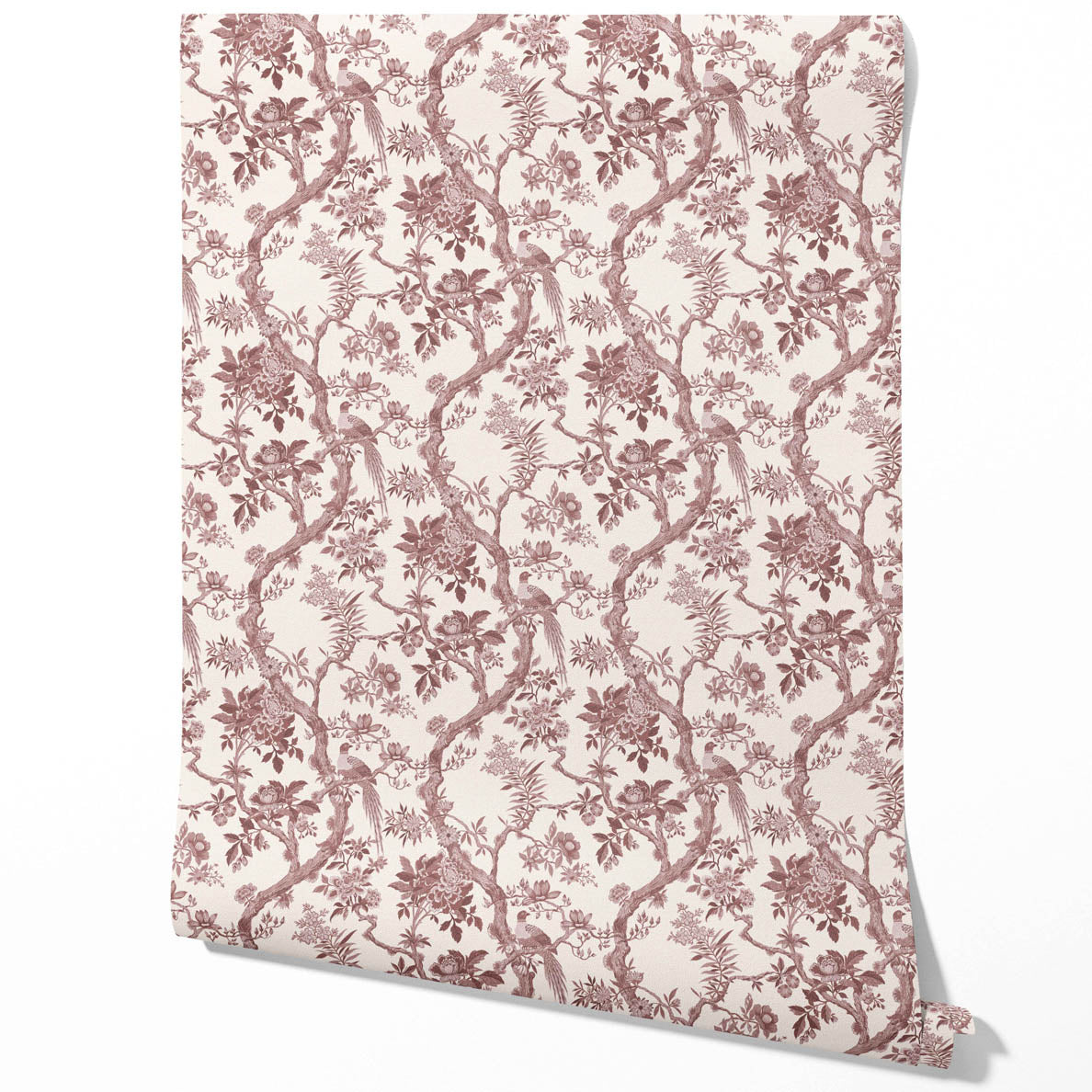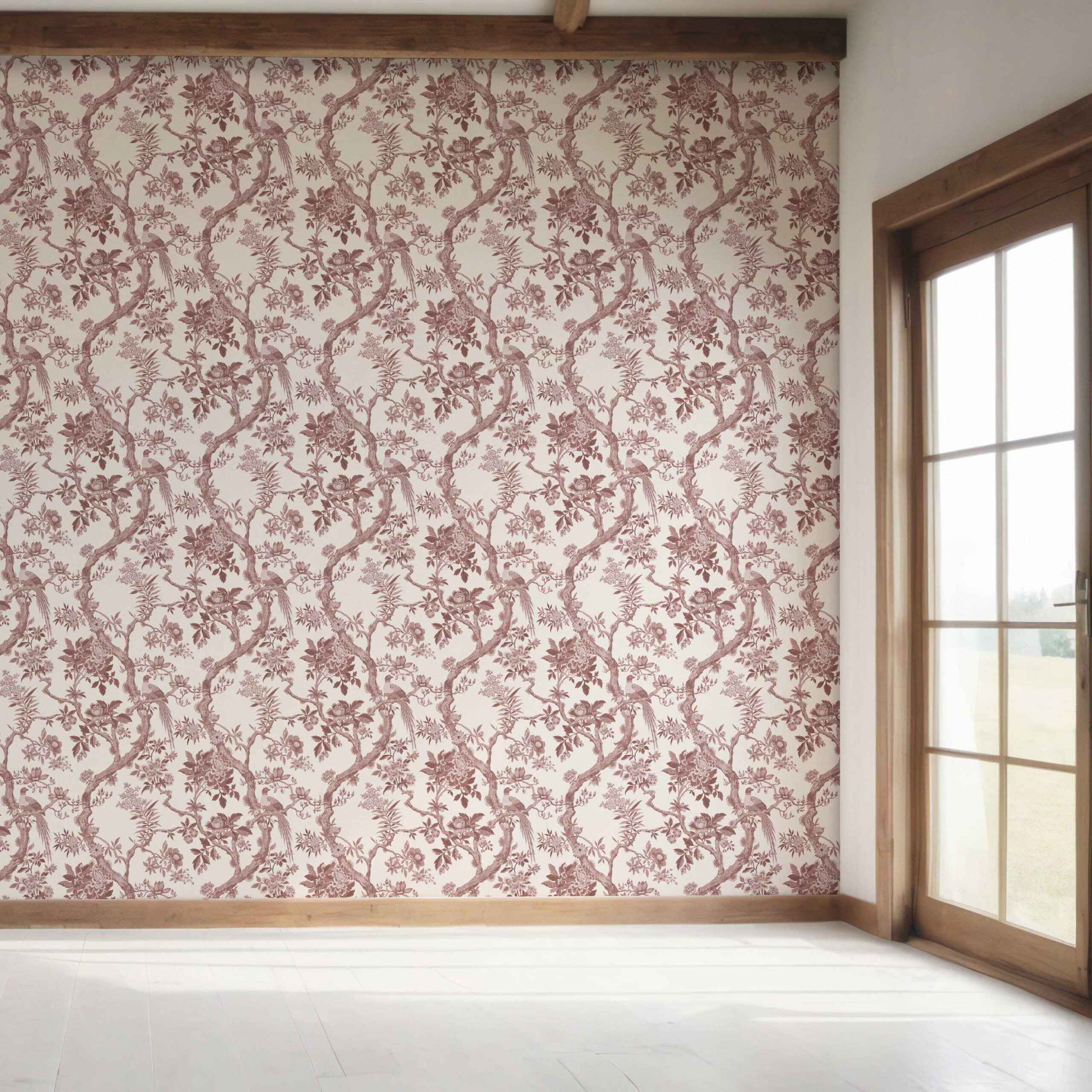 ‘Blooms Berry’ Floral Toile/ Bird Print Chinoiserie Wallpaper (Brick Red/ Burgundy)