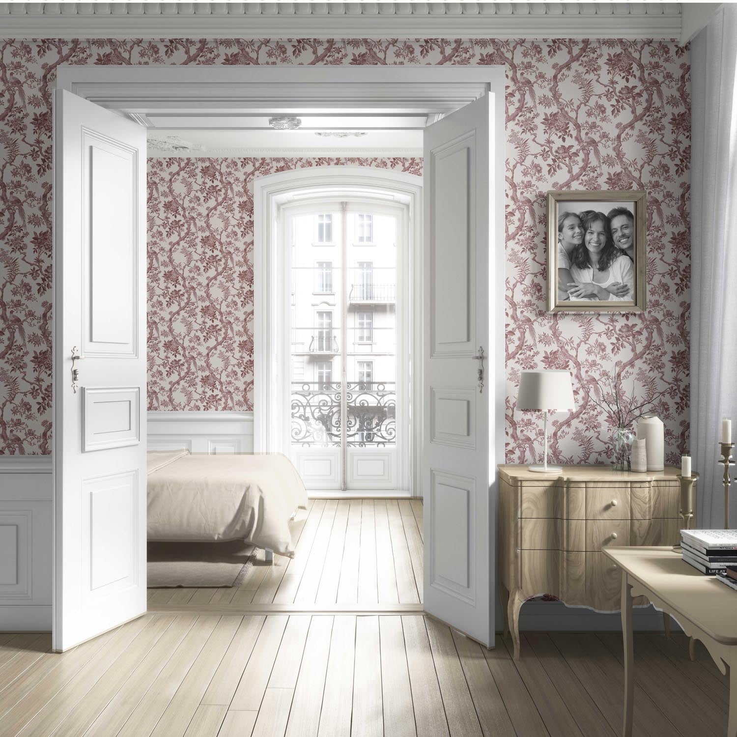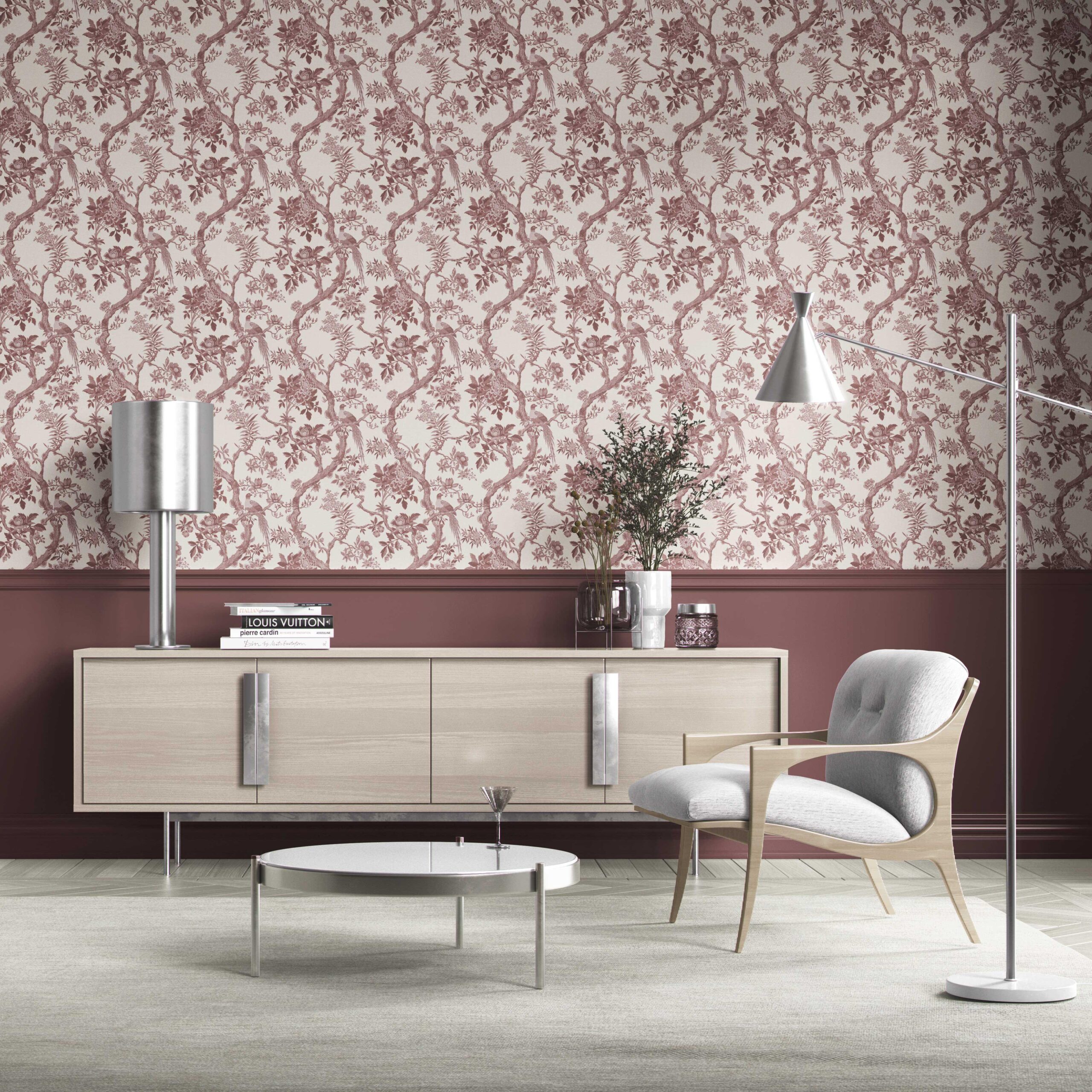 FINISH: ‘Blooms Berry’ is in a textile-inspired, feather-textured, matte-lustre finish, which feels luxurious to the touch. Designed to absorb rather than reflect light, it lends your walls a soft depth and a refined, high-end feel.
