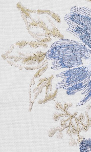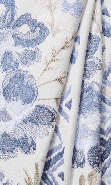 If ‘airy and fairy’ describes your decor style, check out this beautiful embroidered fabric to dress up your rooms. It features floral columns alternating with geometric ones to create a charming effect. A soothing color palette of cornflower blue, sky blue and beige on white looks ethereal.