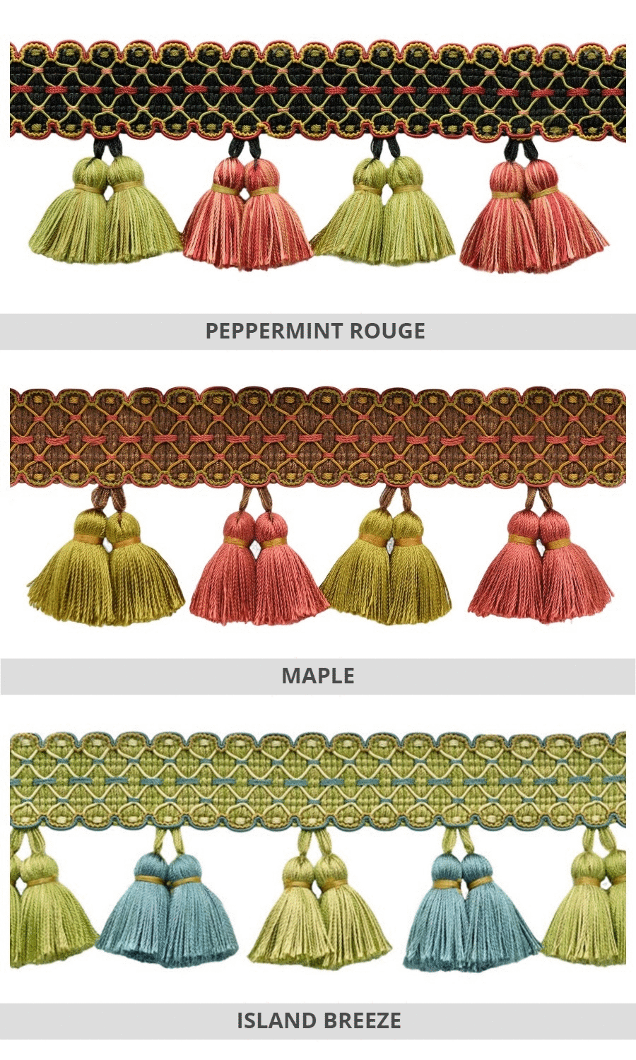 The gimp header is intricately woven and each individual tassel in this trim is hand tied by expert artisans, making each bobble unique. We therefore expect very minor variance between trims and tassels.