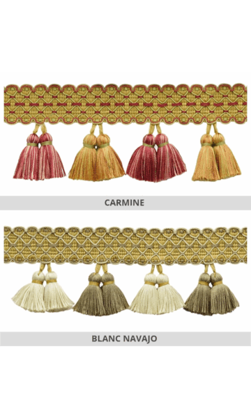 The gimp header is intricately woven and each individual tassel in this trim is hand tied by expert artisans, making each bobble unique. We therefore expect very minor variance between trims and tassels.