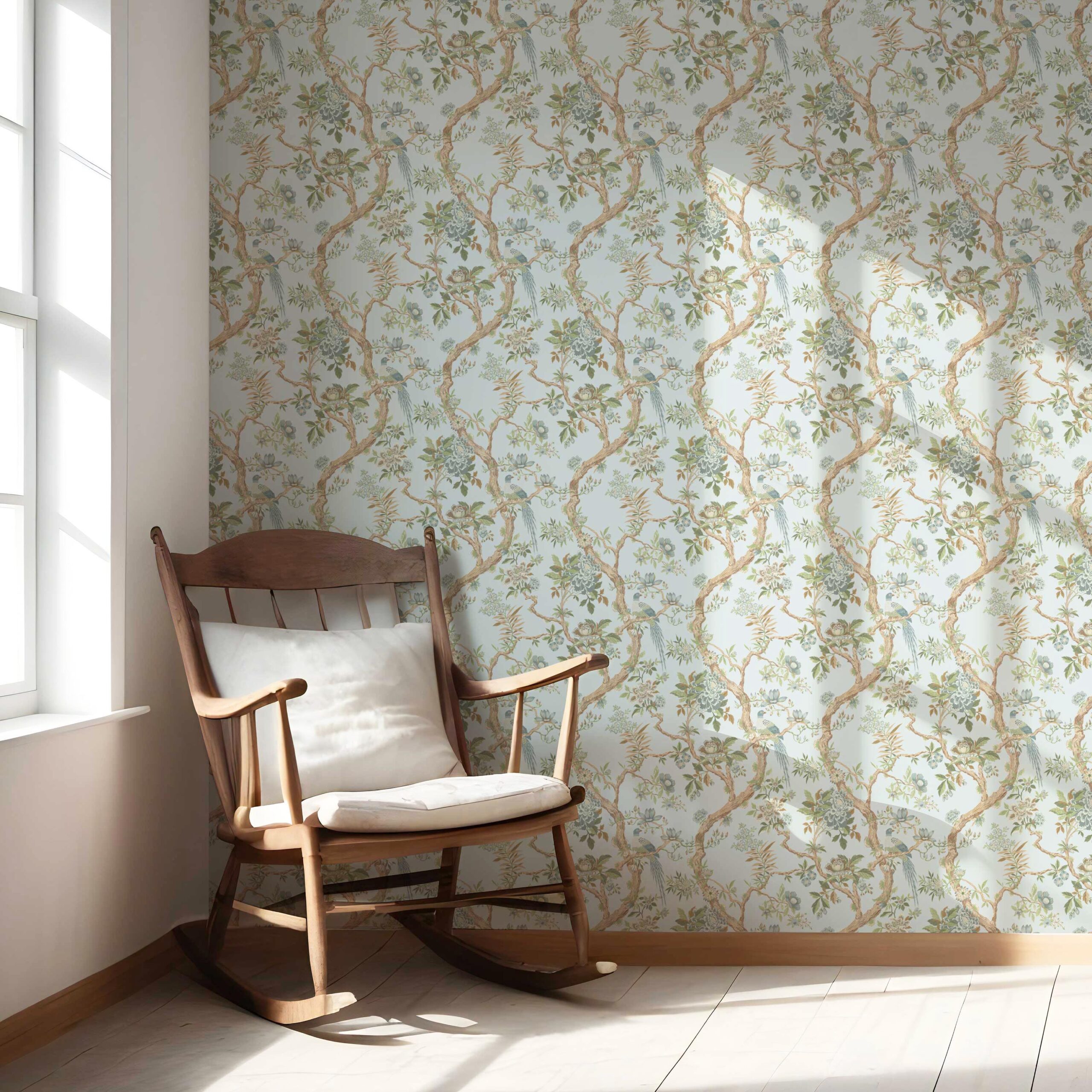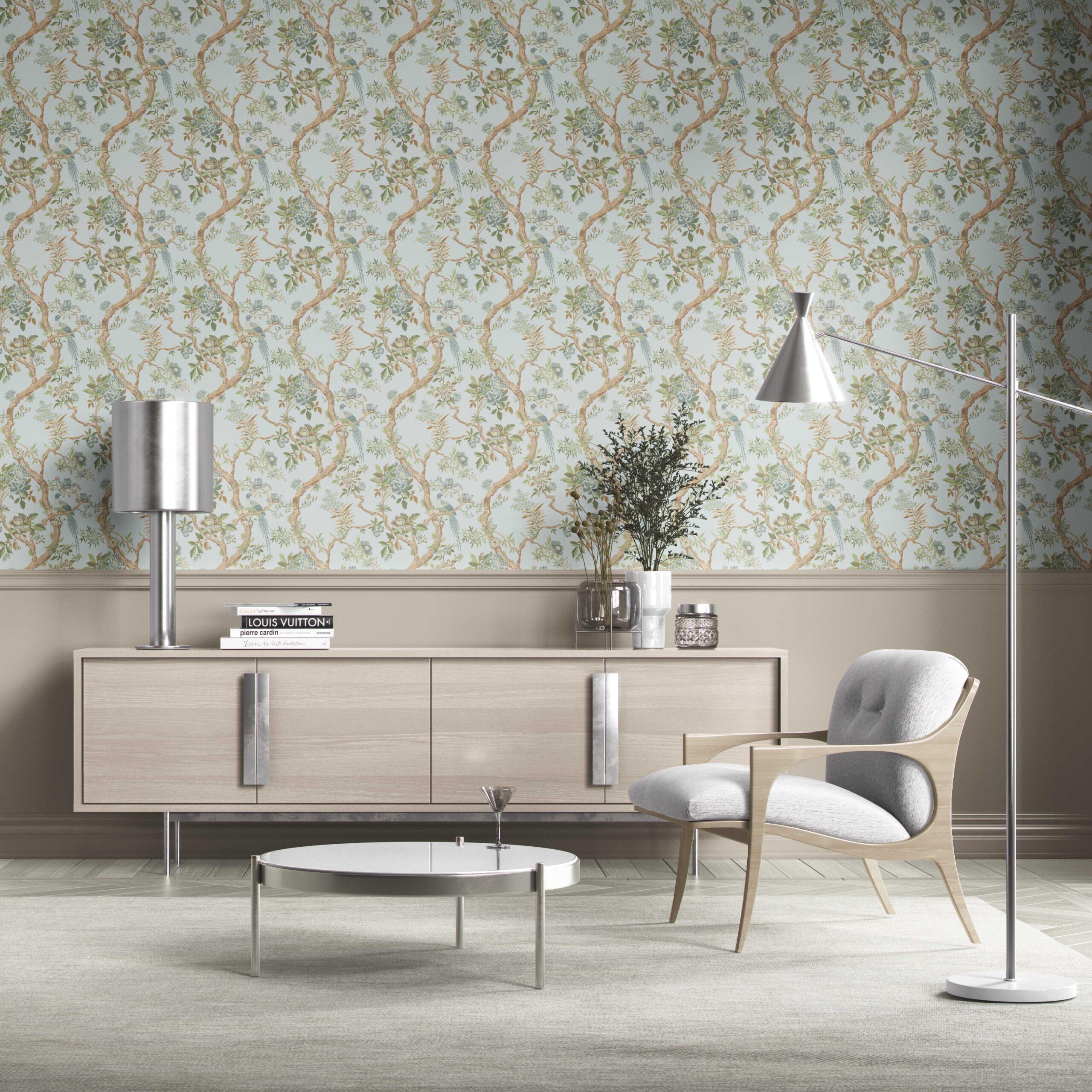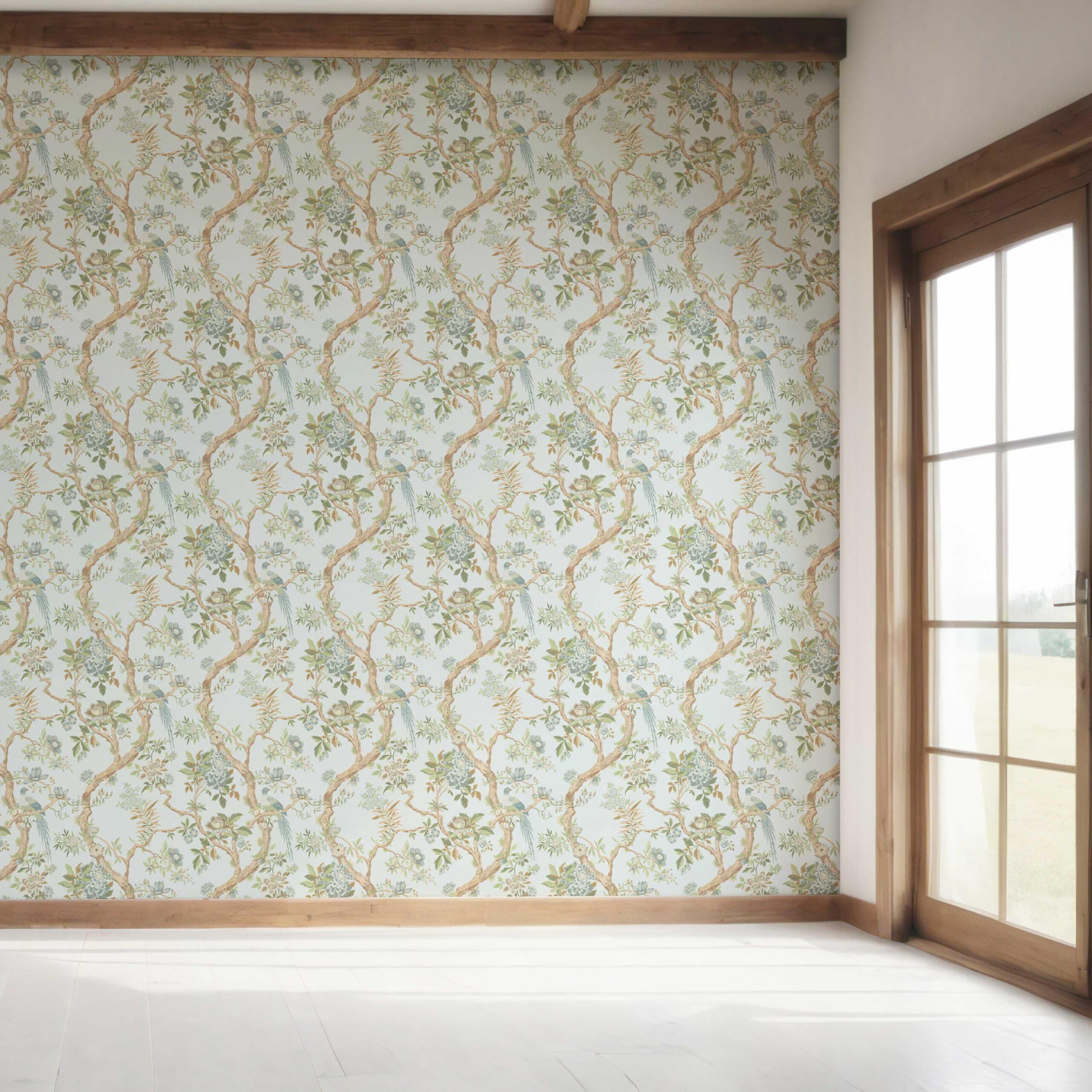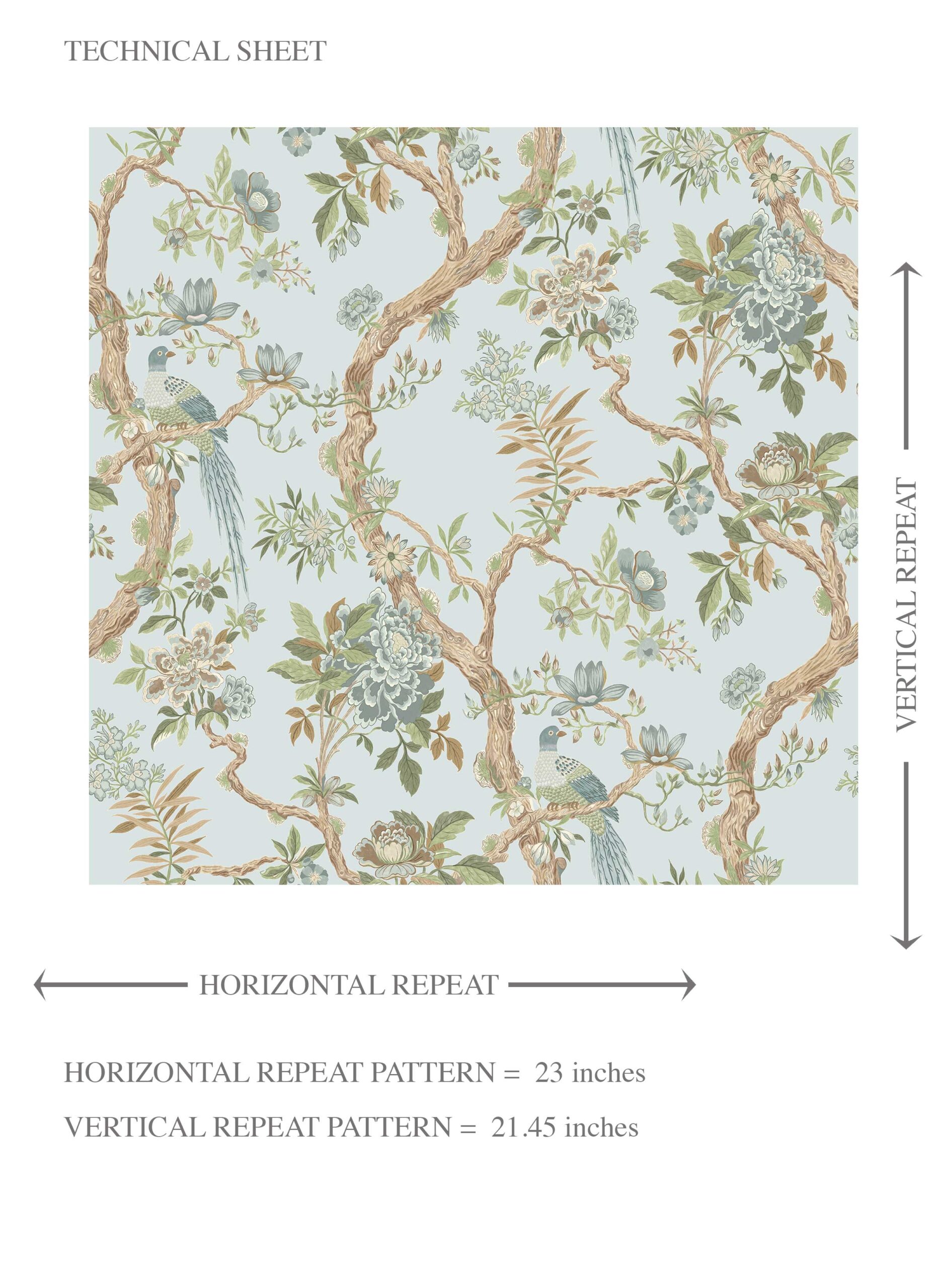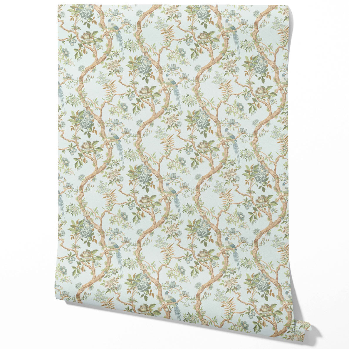 ‘Briarcliff’ Floral/ Bird Print Chinoiserie Wallpaper (Duck Egg Blue/ Green/ Brown)