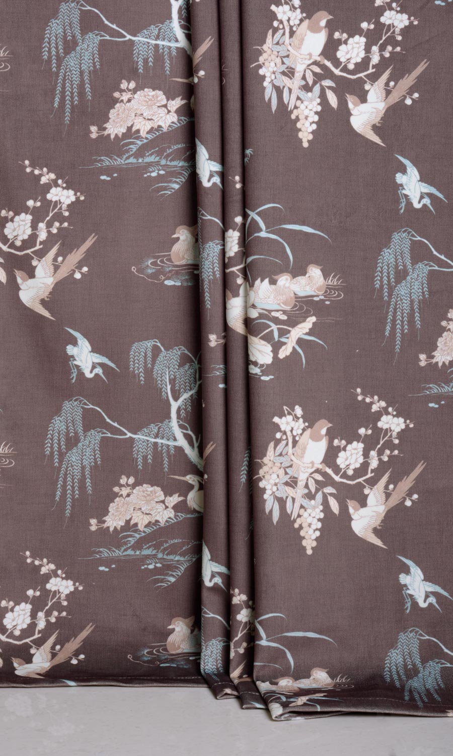 If you love earthy tones and nature themes, here?s a wonderful way to flaunt it. This splurge-worthy brown velvet is for those who love patterns but are not overwhelmed by statement window treatments. Inspired by the traditional chinoiserie and toile motifs, the candid moments of our winged friends have been captured in white, gray and beige highlights in this velvet print. With an army of indoor plants around, you can easily mimic a jungle and dine al fresco right within your home.
