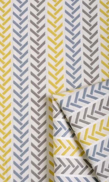 Calma celebrates symmetry and harmony with its cool color palette and horizontal herringbone design. Its white base is patterned with columns of herringbone zigzags in yellow, steel blue and grey. This simple yet stunning fabric can visually elongate your windows. We recommend it for draperies or roman blinds for a clutter-free space.