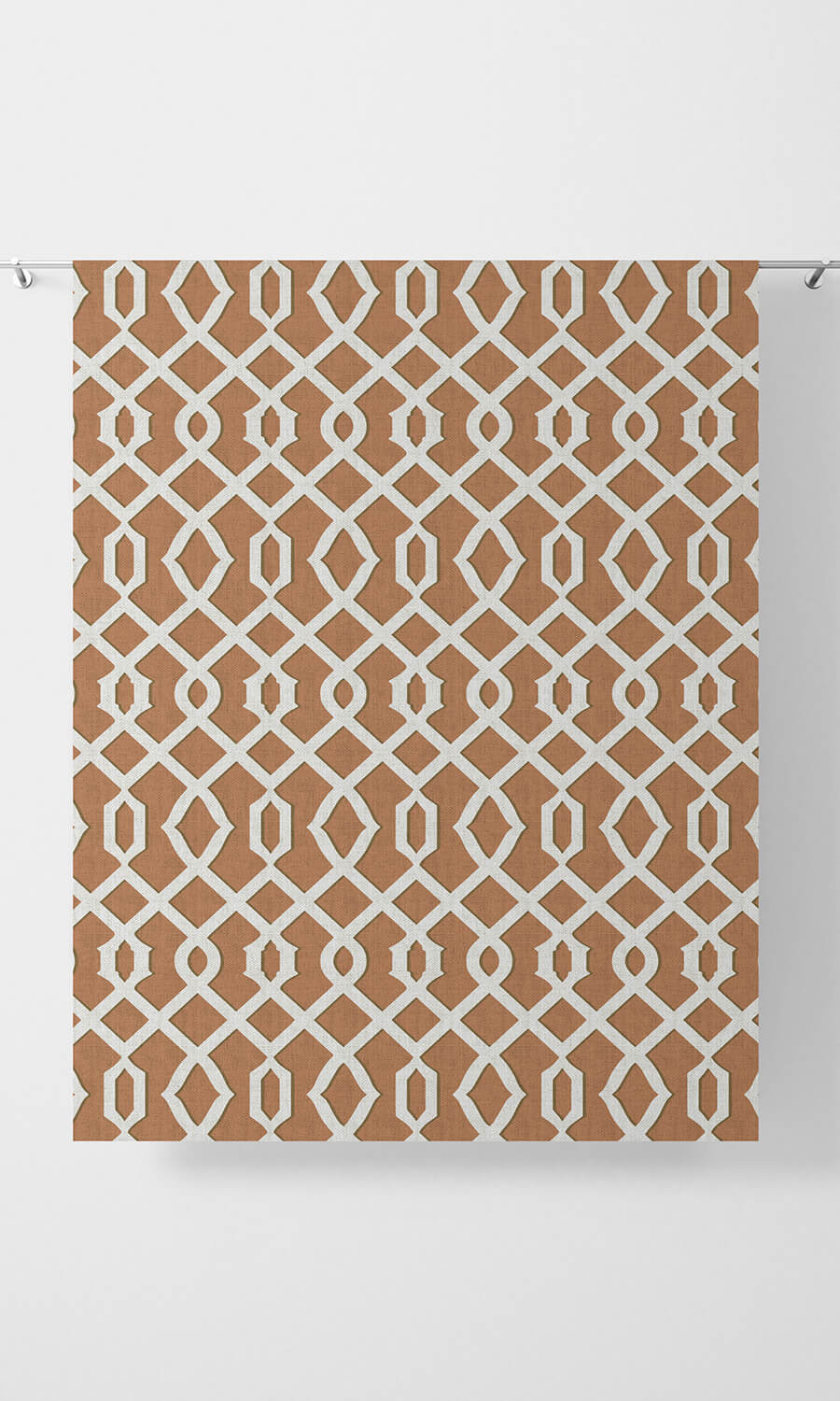 This rust orange and white fabric makes a beauteous presentation of the classic Moroccan trellis motif in a vibrant palette. The continuously flowing pattern that makes a pleasing meld of curvy shapes and straight lines is a visual treat and serves as a glad break among solid colored elements. The rich color palette enables window treatments in this fabric to stand out as a statement piece.