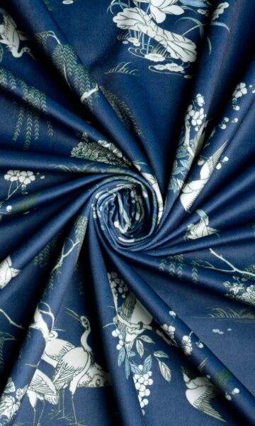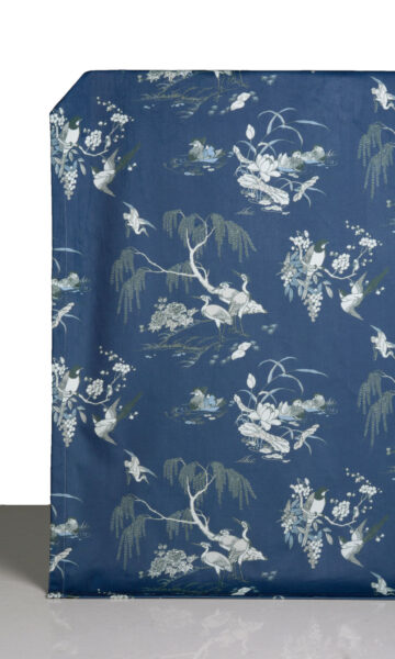 If you love flaunting your love for nature in your home decor, here?s a drapery fabric that can answer the call. Inspired by the classic toile and chinoiserie motifs, this gorgeous velvet print features illustrative sketches of cranes, larks, and swans. Feel drawn to nature?s laps instantly. Curtains and roman shades in this navy blue velvet tinged with white, green, and powder blue accents offer a delightful contrast to light-colored walls.