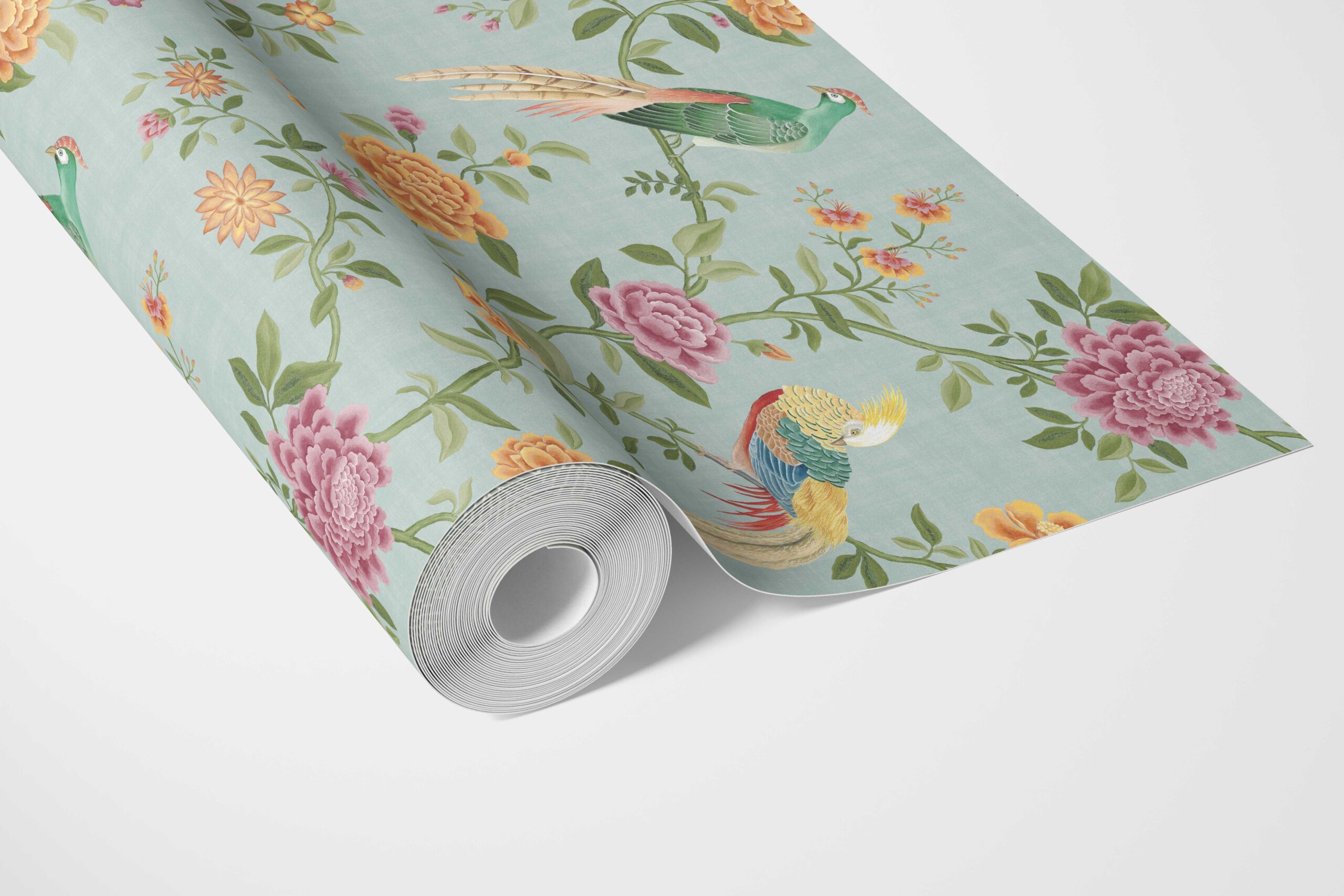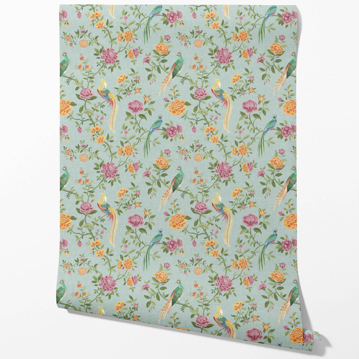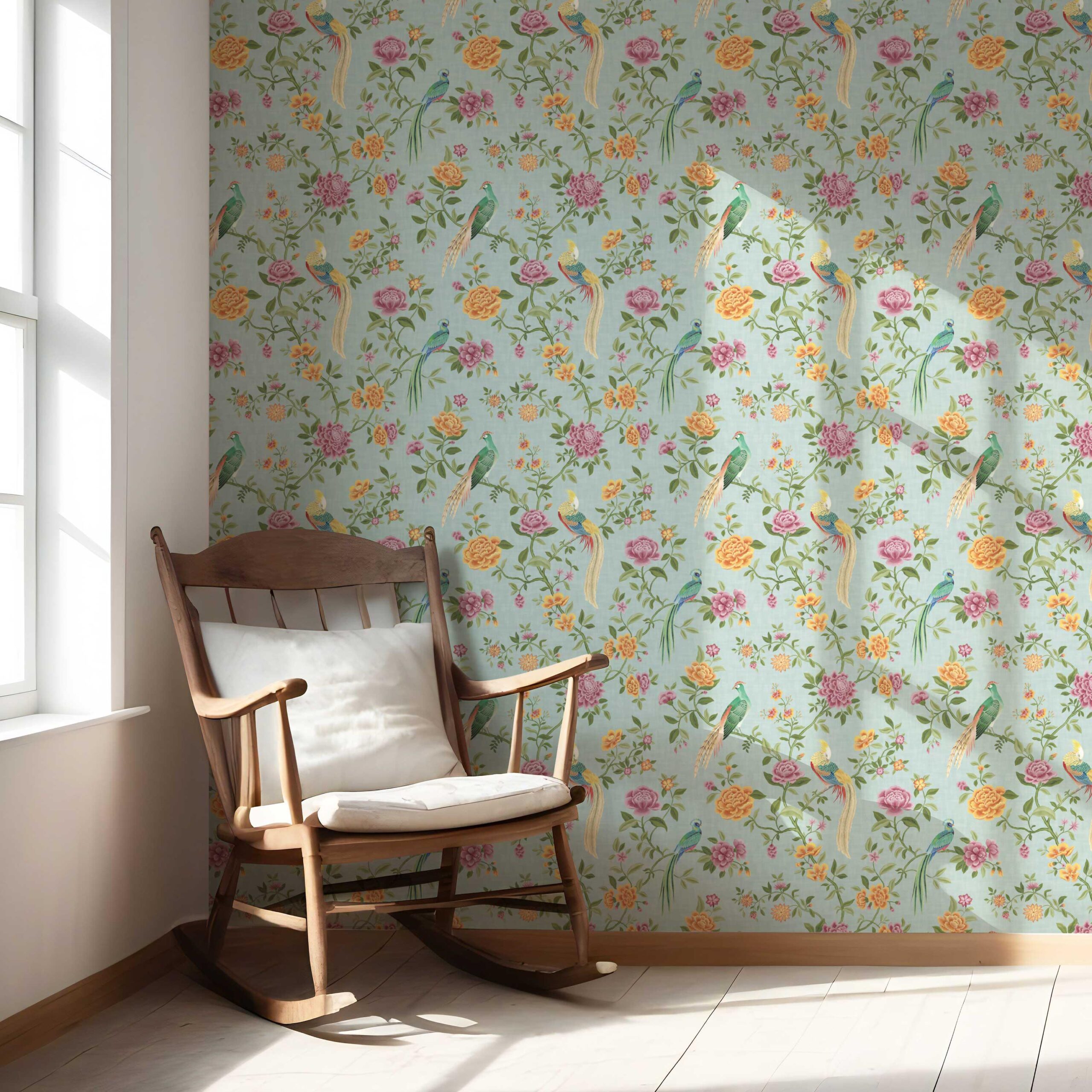 ‘Cherokee’ Floral Chinoiserie/ Nature Bird Print Wallpaper (Blue/ Pink/ Green/ Yellow/ Orange)