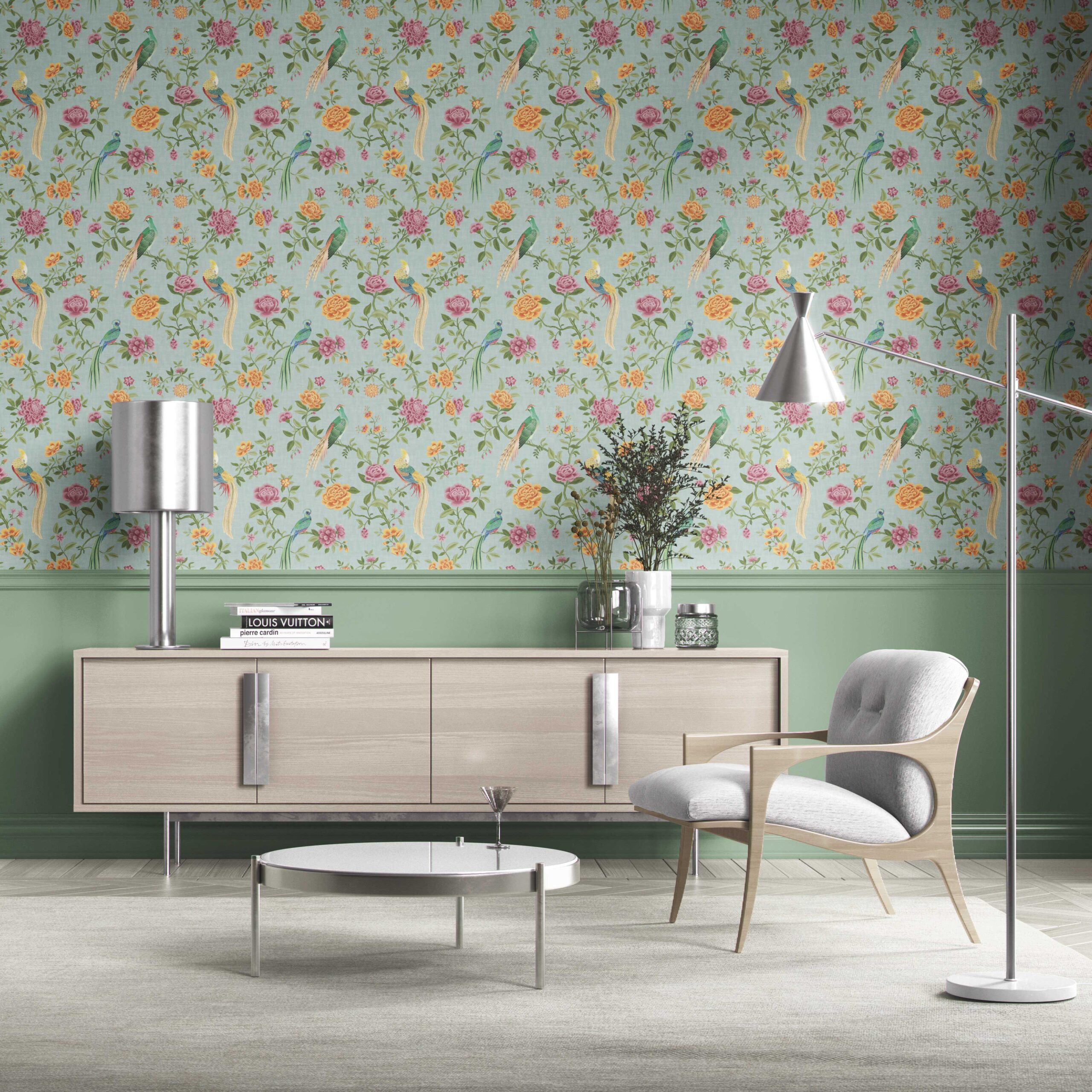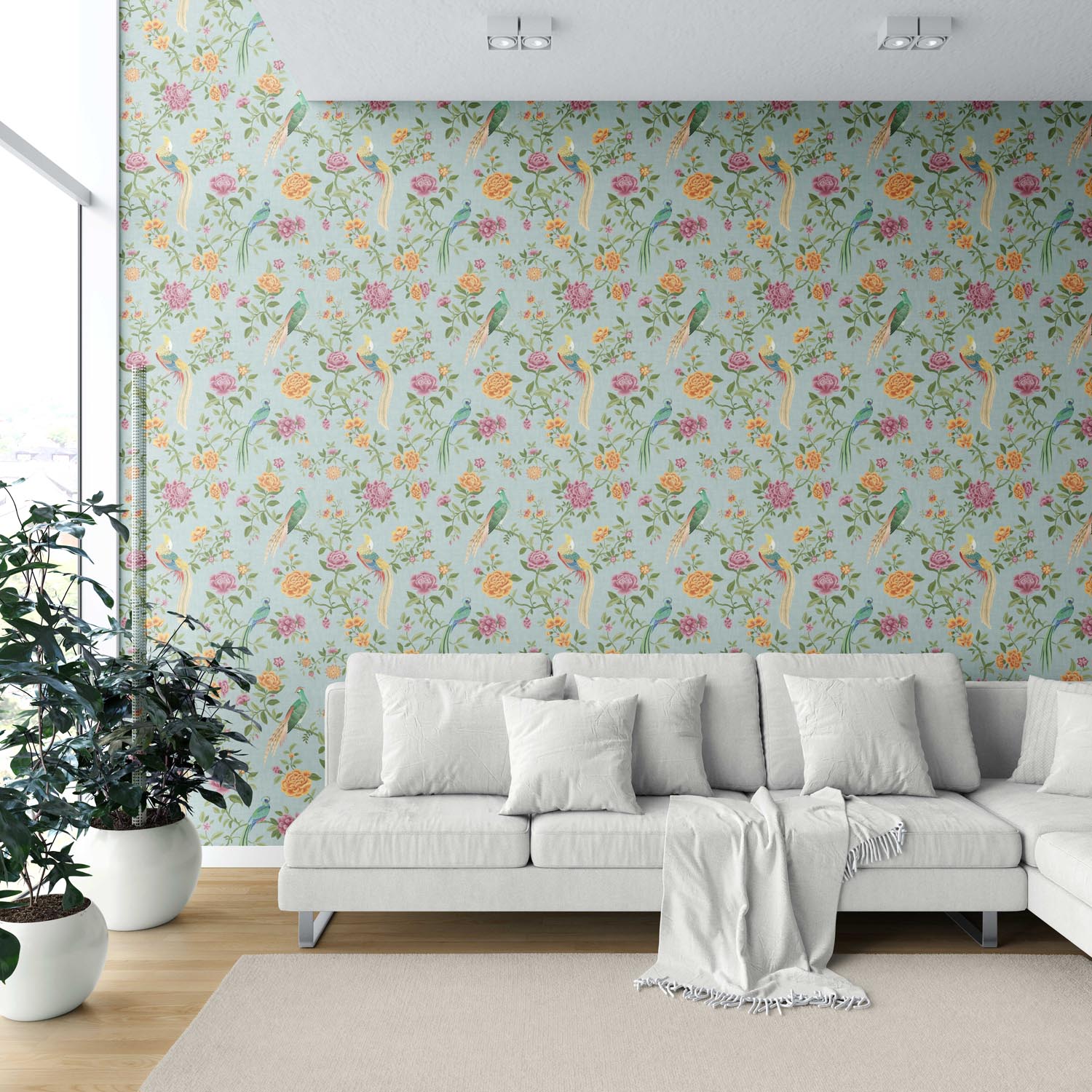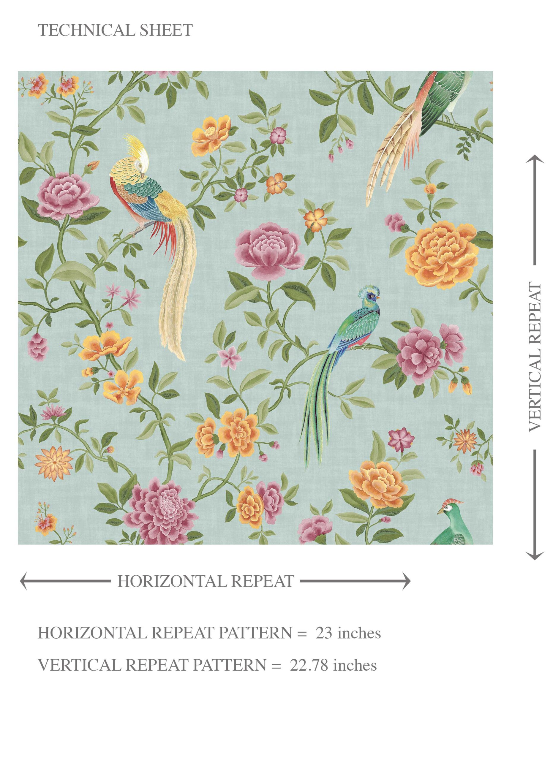 ‘Cherokee’ Floral Chinoiserie/ Nature Bird Print Wallpaper (Blue/ Pink/ Green/ Yellow/ Orange)