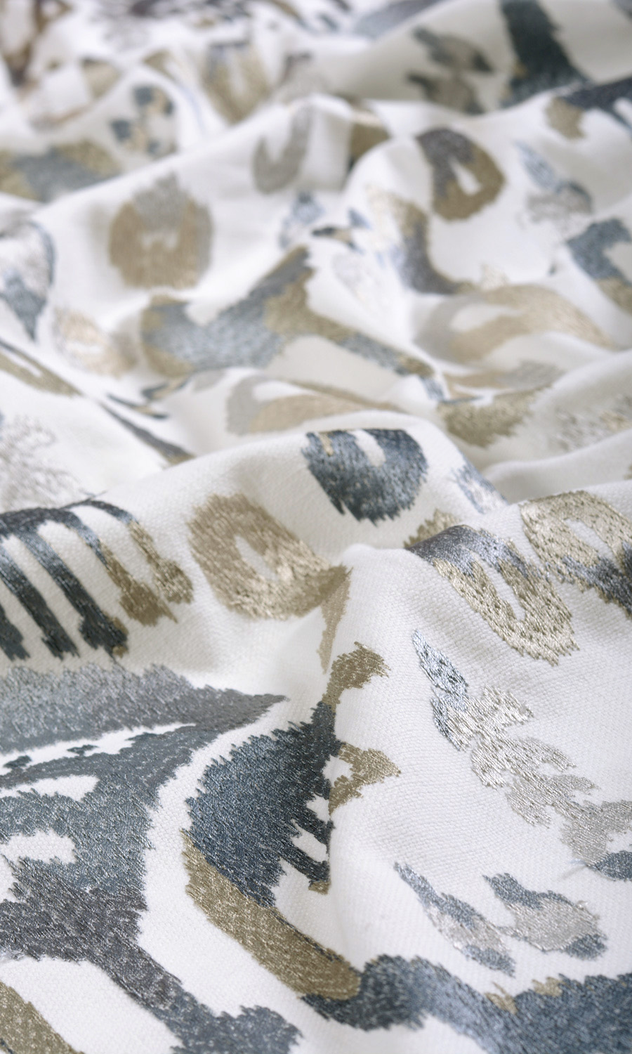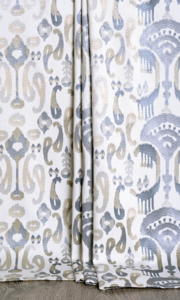 Want the stately Art Deco look in your space? Begin with drapes crafted in Chiaro. This bold and beautiful fabric with its white and gray color palette has a smart Art Deco inspired pattern. Embroidered with shades of gray ranging from palest silvery gray to a dark steel one, this one is a chic choice for a charismatic look.