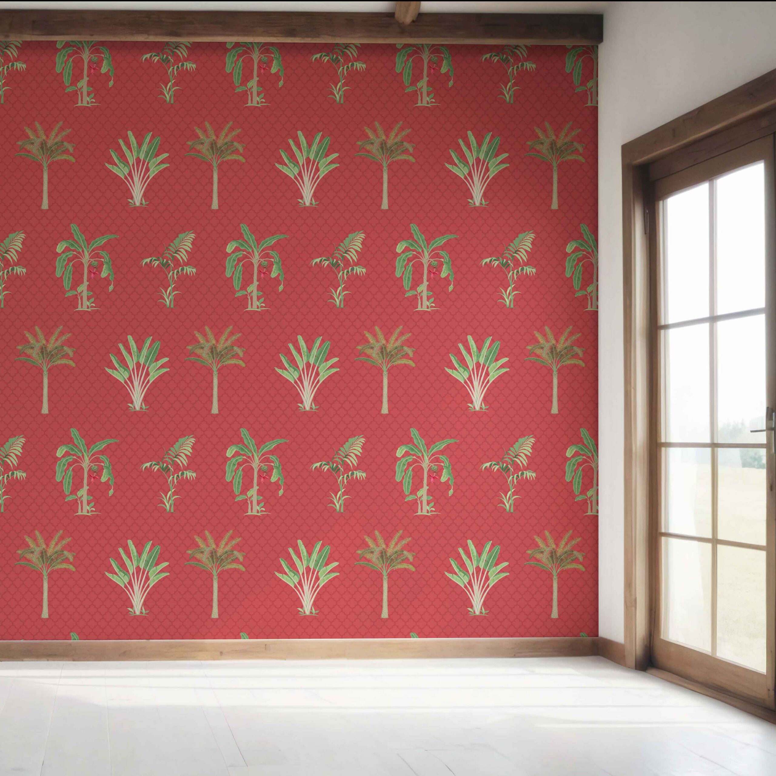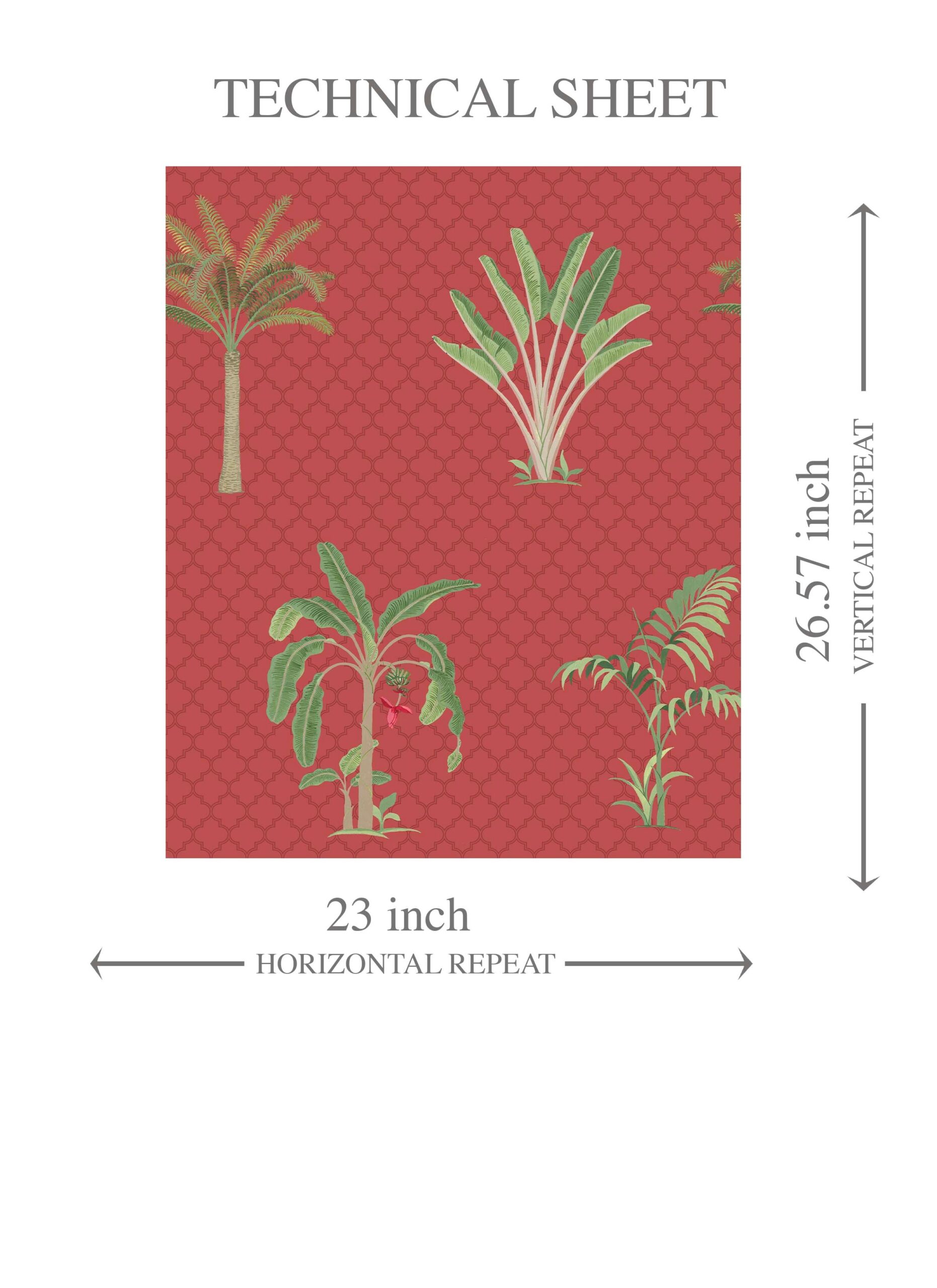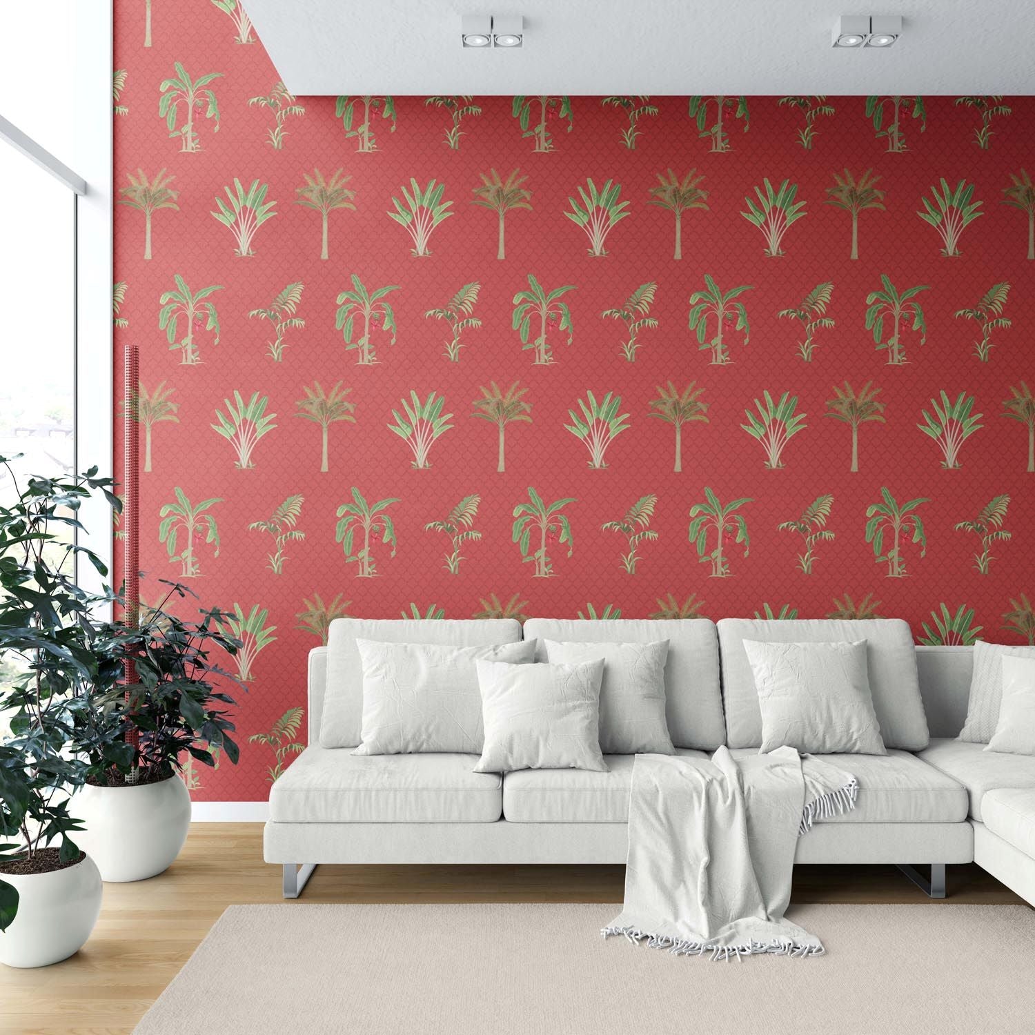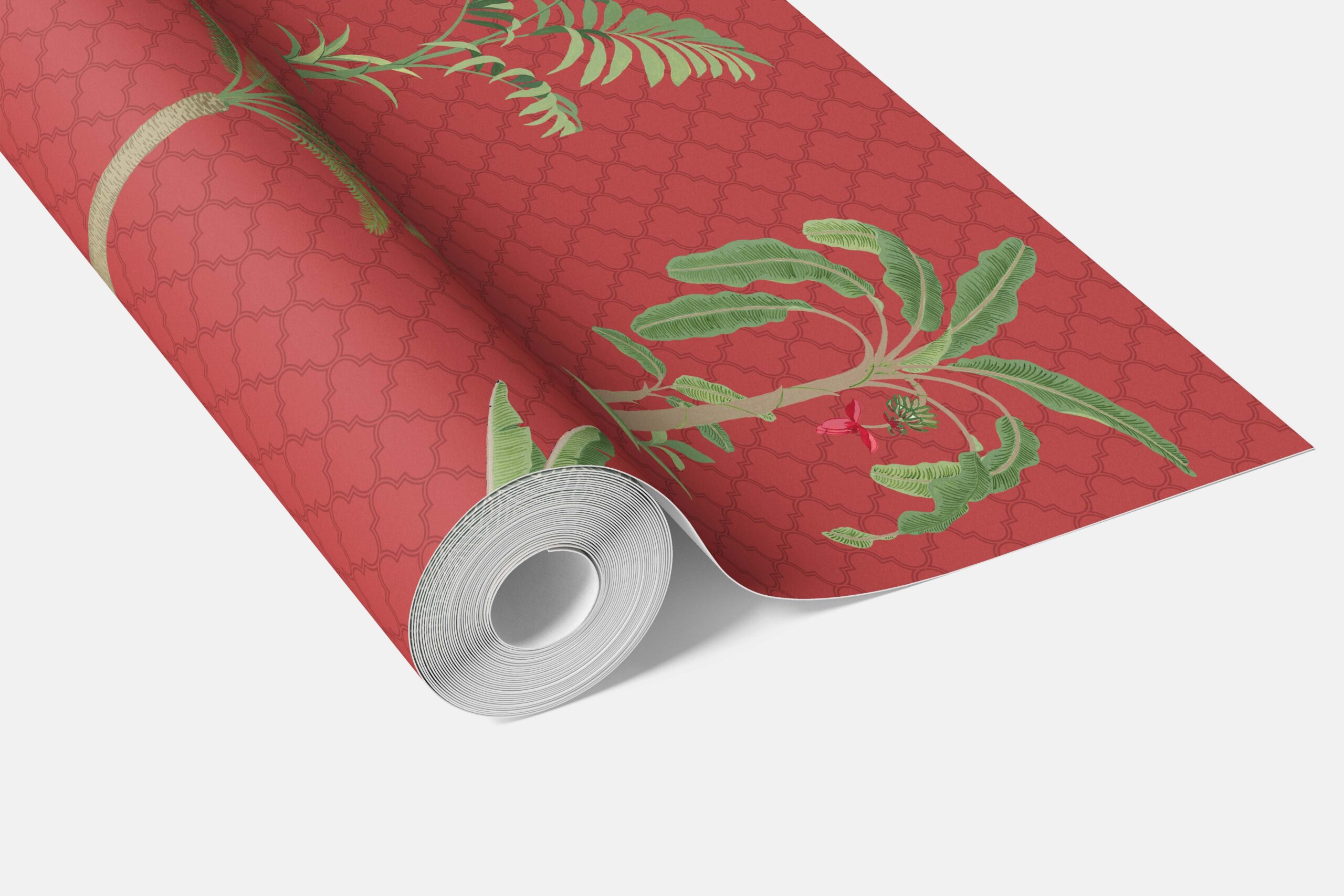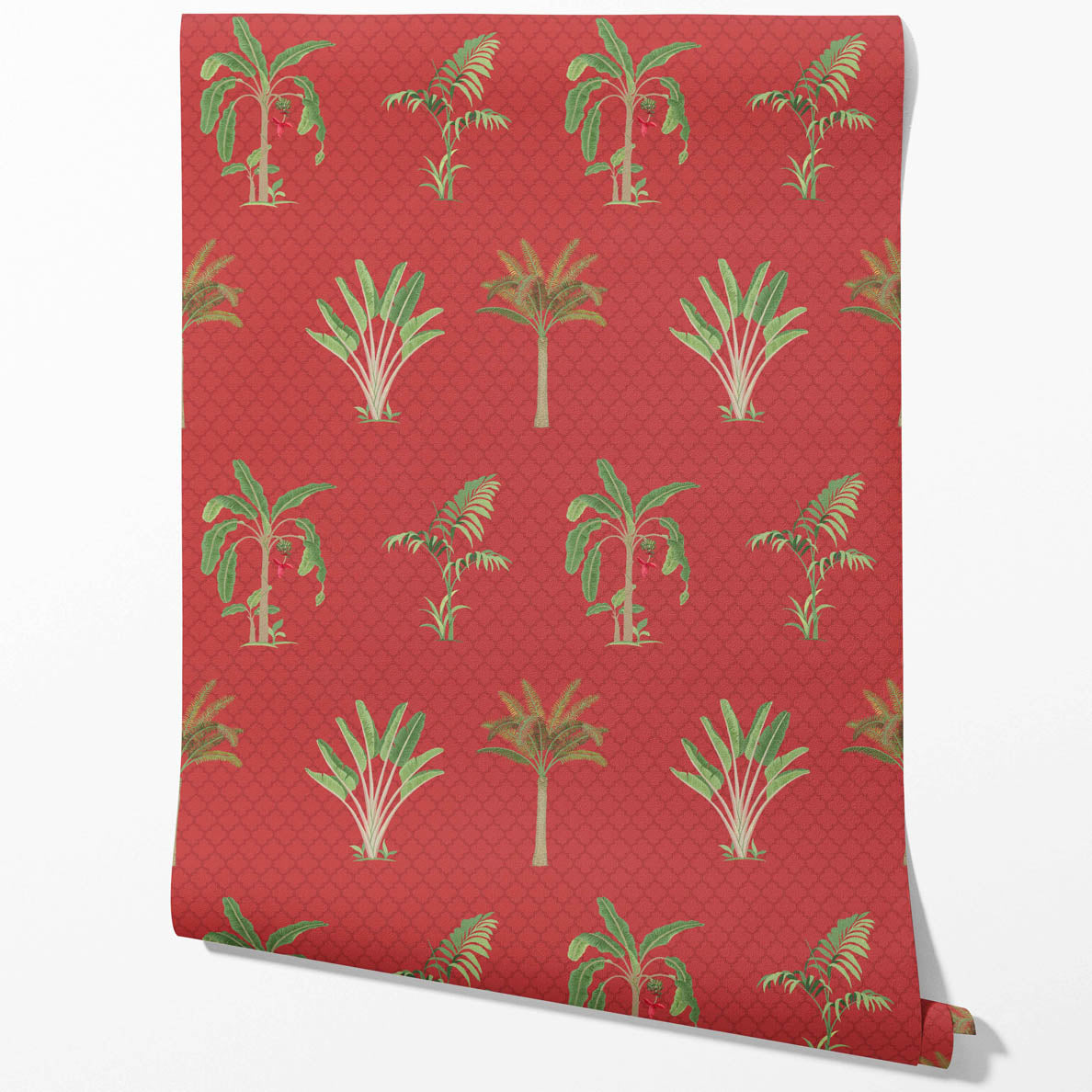 ‘Convergence’ Botanical/ Floral Block Print Wallpaper (Red-Orange Green)
