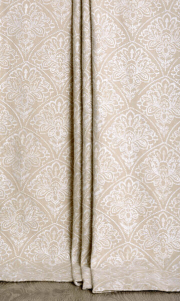 Inspired by draperies of aristocratic chateaus of France, this oatmeal beige fabric has a rather neutral base that’s covered from edge to edge with a delicate and elaborate pattern in white. The design is rich with decorative leaves, buds and flowers placed inside curved and pointed contours. The effect is regal. A good choice for formal area draperies.