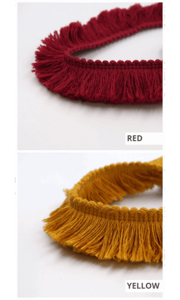 Cotton brush fringe trims are handsewn on left and right edges of curtain panels for a delightful effect.