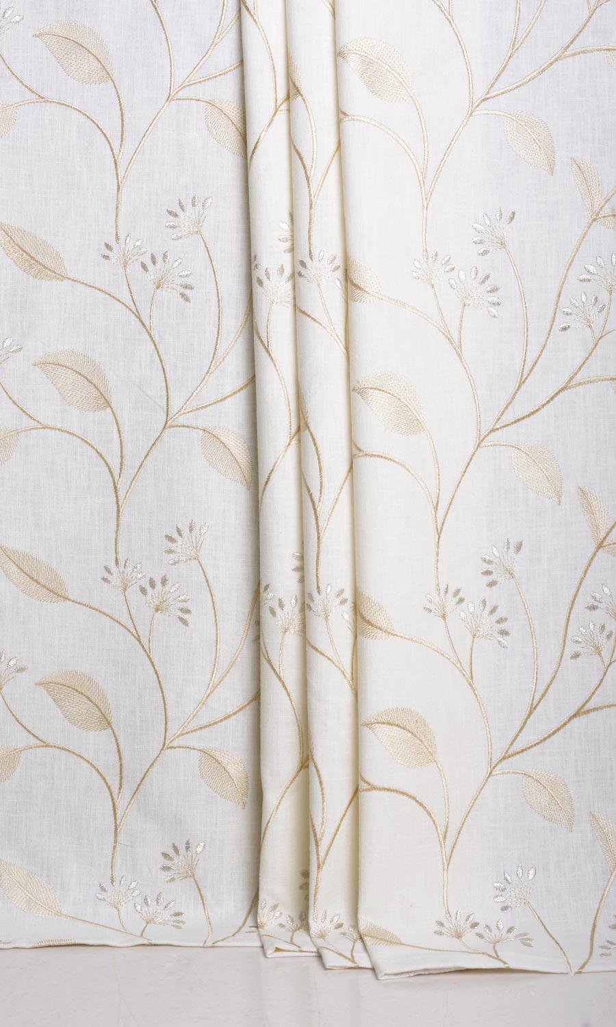 Speaking more with few words, this cream drapery fabric presents floral motifs with subtle contrasts and artistic finesse. Leaves and blooms on slender stalks, embroidered delicately in tones of ivory, give off the sophisticated flair of the nature theme impressively. The neutral palette ensures easy blending with diverse color schemes and decor styles.
