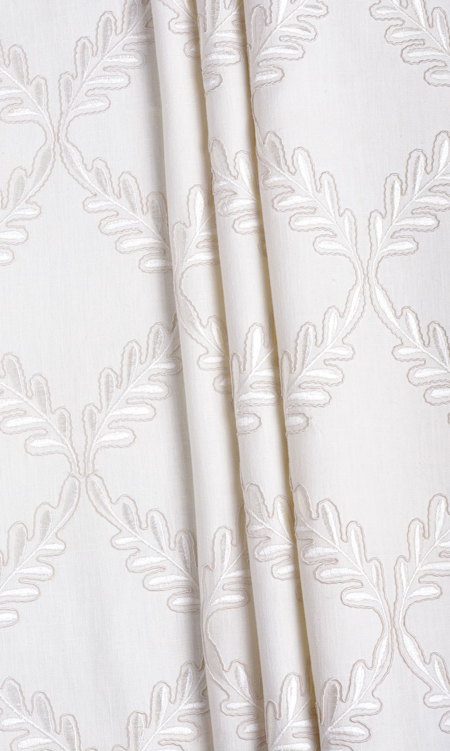 Those who love geometric patterns as passionately as floral designs can now gratify their design aspirations in this linen-blend. Slender sprigs move rhythmically from top to bottom caving in at intervals to form a harlequin pattern. Window treatments in this white fabric with tone-on-tone cream embroidery make a gorgeous visual treat with subtle contrasts.