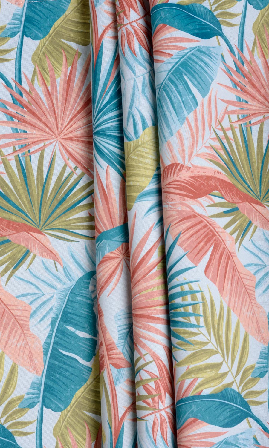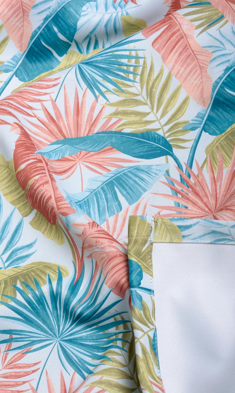 Leaf prints in vibrant hues – a modern expression of a nature-inspired theme. Blues and greens dominate the large graphics of tropical leaves on a powder blue backdrop making a great window dressing for a color-saturated space. If you love to decorate your home with indoor plants but lack a green thumb, ?Feather Blue? can be a solace with its outdoorsy vibe.