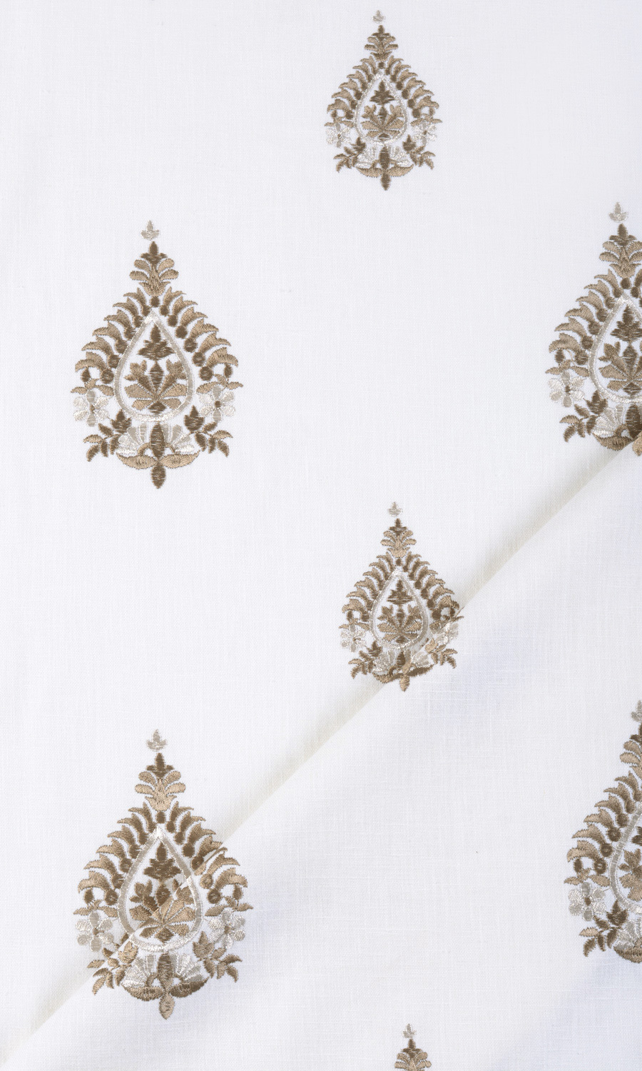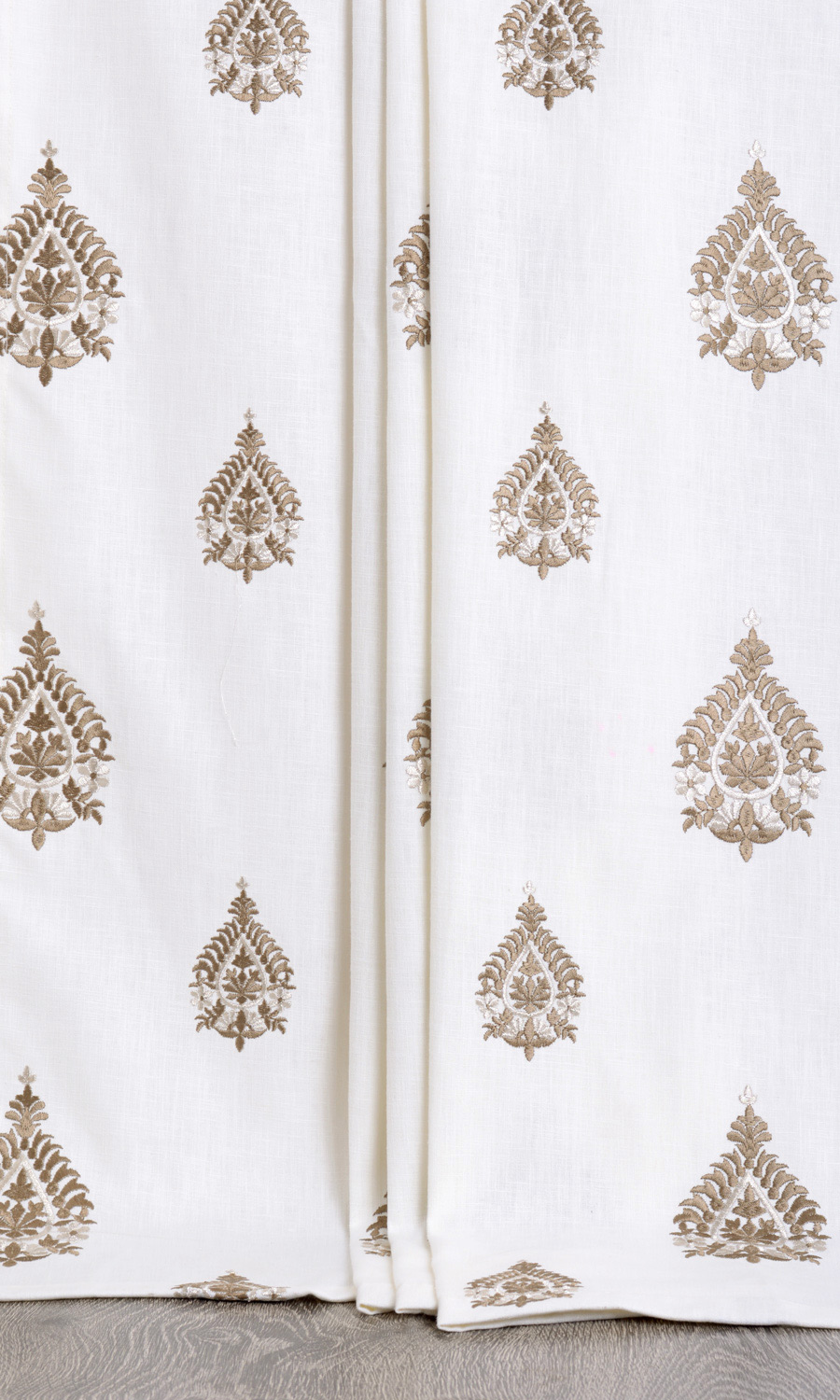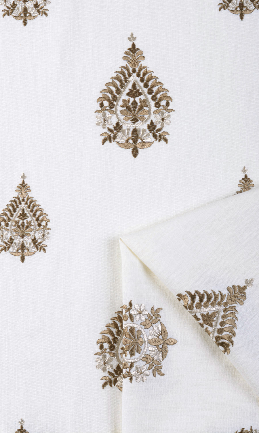 The famed beauty of Persian designs is here to grace your interiors through Dijon the drapery fabric. The smooth look fabric has an off white base material that’s a sturdy blend of cotton, polyester and viscose. The surface has been embroidered in coffee brown with an elaborate Persian paisley inspired motif with stylized foliage and buds. This fusion of traditional design with contemporary color palette gives a unique look.