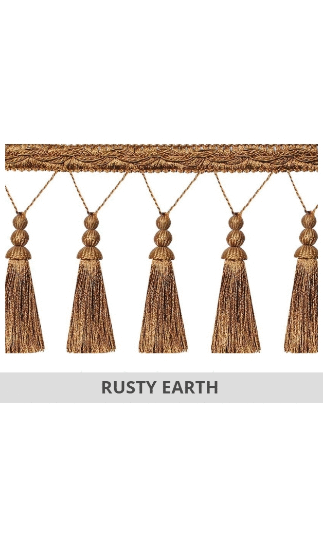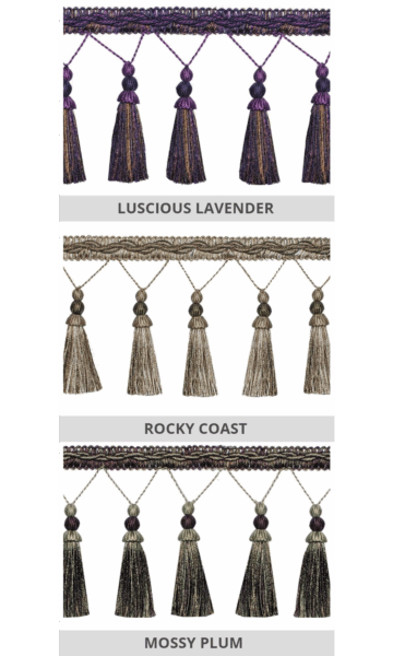 Dijon is a luxuriously long, beaded tassel trim, measures 165 mm (6.5 inches) from top to bottom, and is available in 10 colorways.