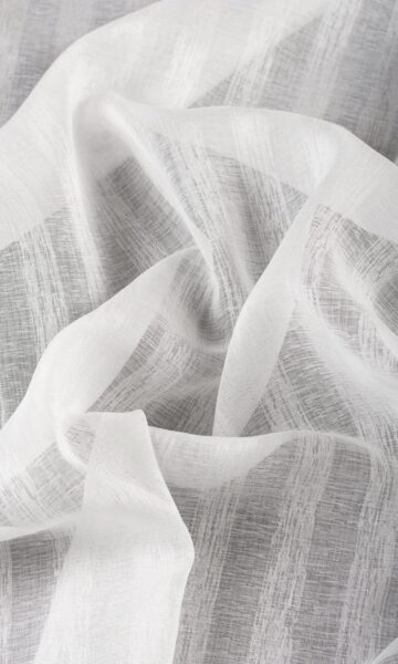 The epitome of simplicity and ethereal charm! A pure white sheer with a wee bit of detail hidden in its textured stripes, ‘Zephyra’ offers the dreamy elegance that sits right in a coastal home, a country cottage and a modern condo with equal ease. Light, breathable and timelessly elegant, this sheer is characterized by a calm, uncluttered visual appeal and guarantees privacy during the day while welcoming light.