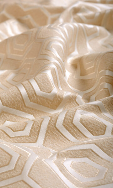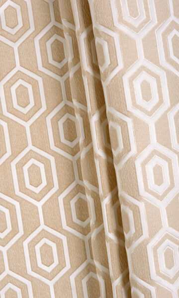 A jacquard that’s definitely a cut above the more common traditional floral jacquards. It features a stylized honeycomb pattern in gentle shades of sand beige and pure white. The look is simple and angular with hexagon-in-hexagon elements adding a geometric symmetry to it. Simple and simply stunning, that’s Doku for you.