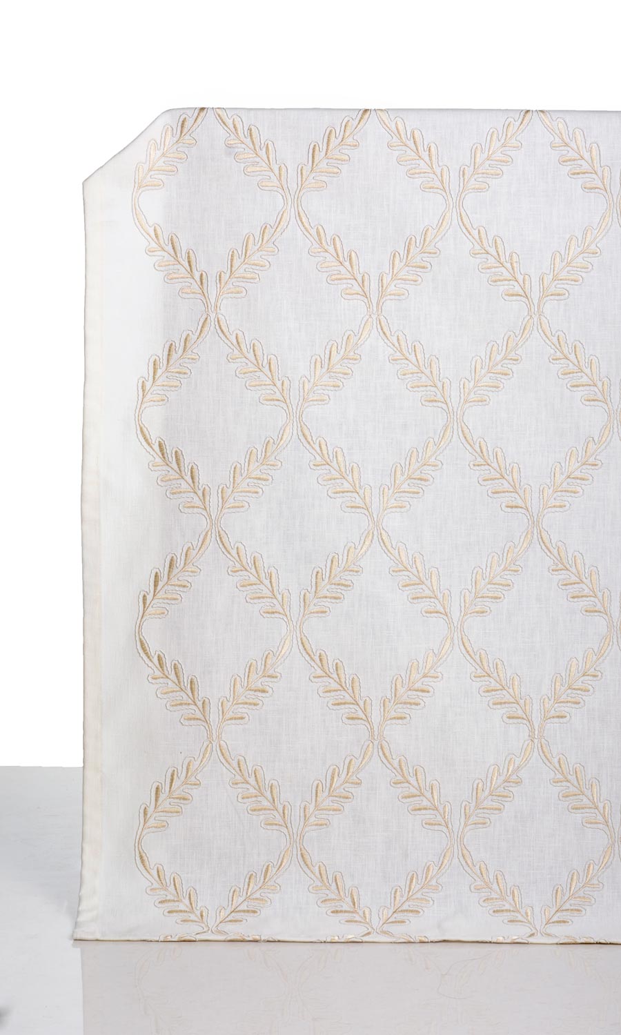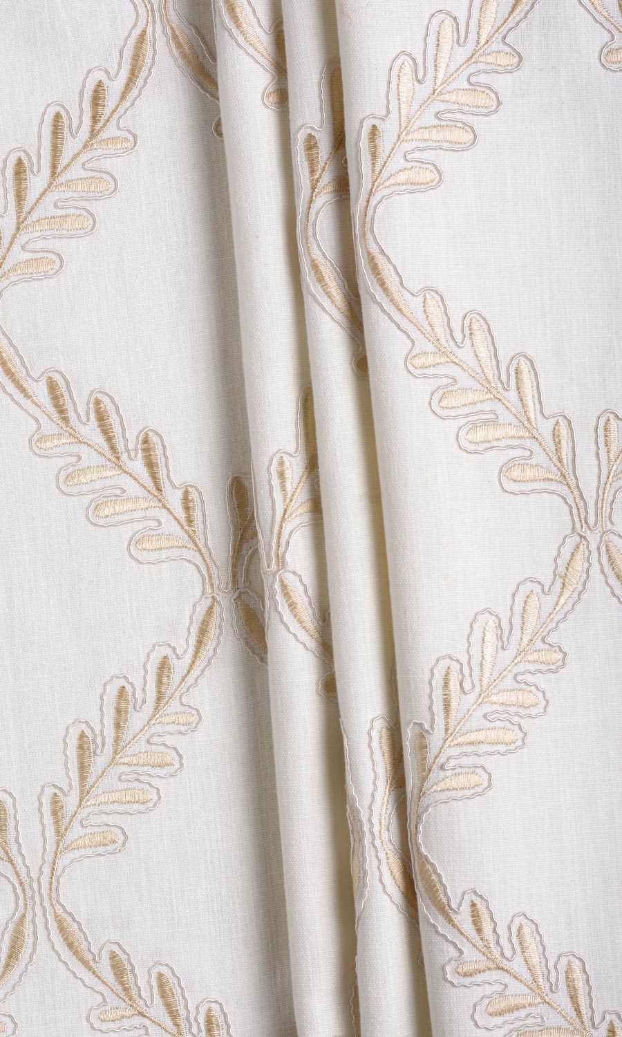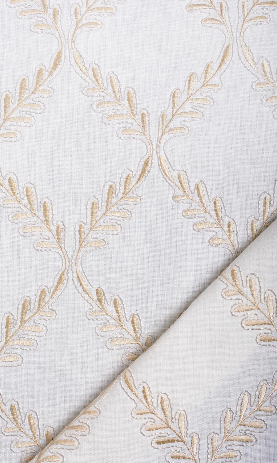 Those who love geometric patterns as passionately as floral designs can now gratify their design aspirations in this linen-blend. Slender sprigs move rhythmically from top to bottom caving in at intervals to form a harlequin pattern. Window treatments in this white fabric with delicate beige embroidery make a gorgeous visual treat with subtle contrasts.