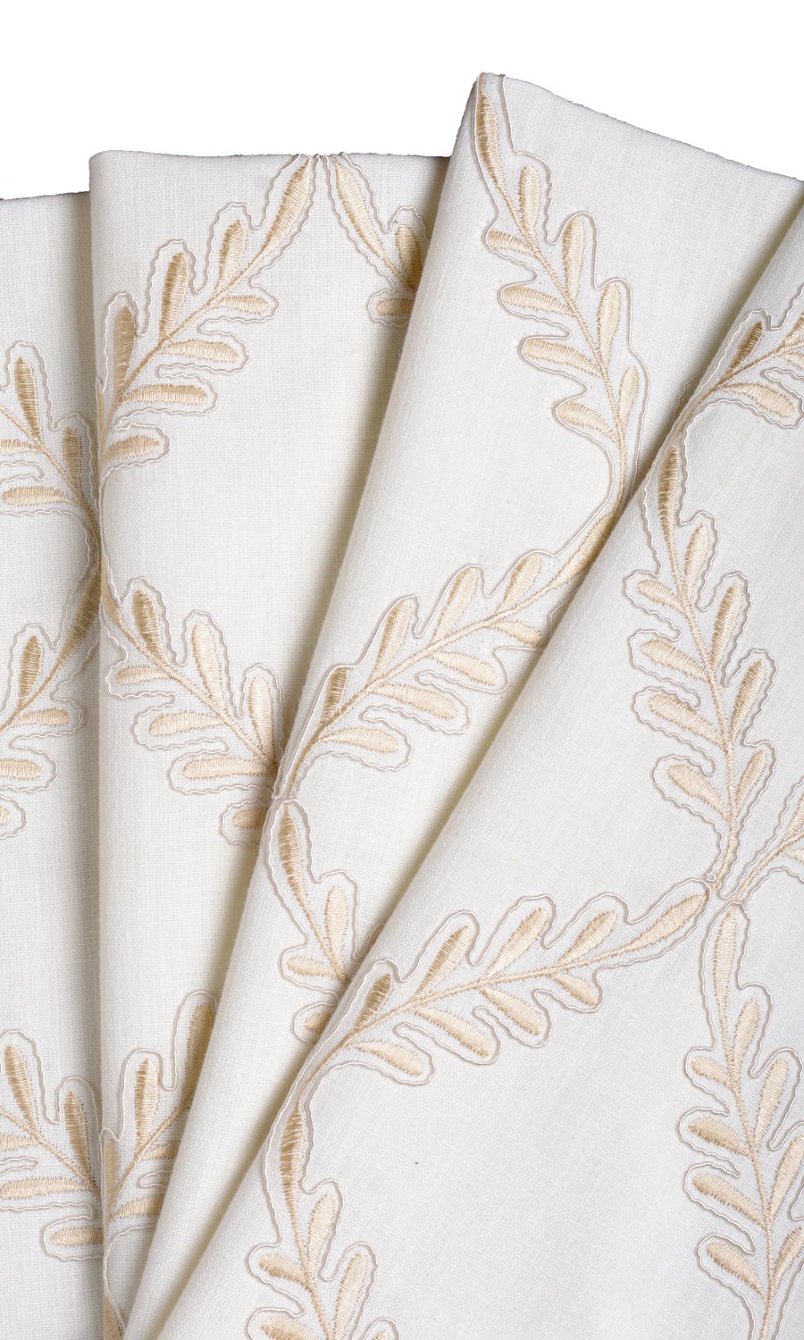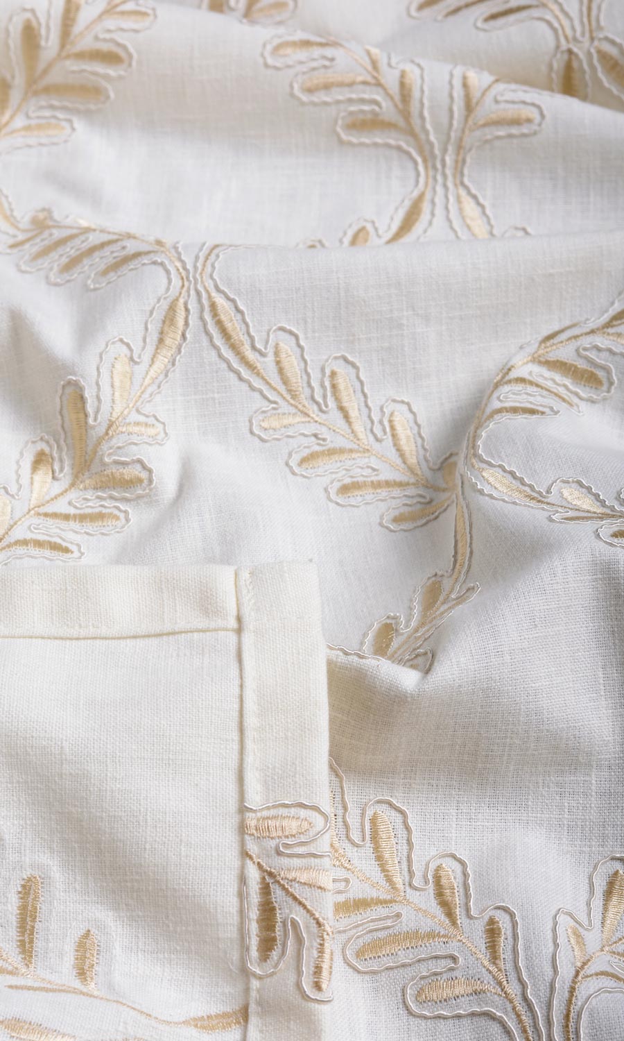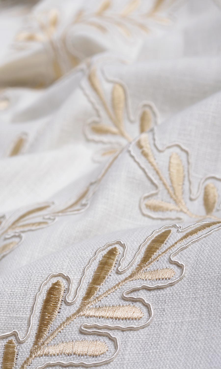 Those who love geometric patterns as passionately as floral designs can now gratify their design aspirations in this linen-blend. Slender sprigs move rhythmically from top to bottom caving in at intervals to form a harlequin pattern. Window treatments in this white fabric with delicate beige embroidery make a gorgeous visual treat with subtle contrasts.