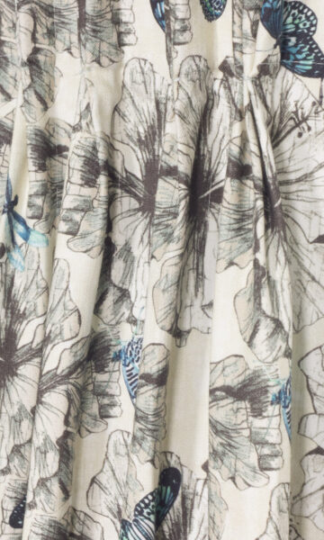 Cotton with a modern twist on florals. Fresh and spring-like with blue accents on lighter tones of grays and beige. The floral design is definitely on the larger than life side while the colorway is gentle and soft; it’s a mixed bag that works so well. Perfectly and utterly elegant.