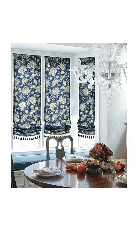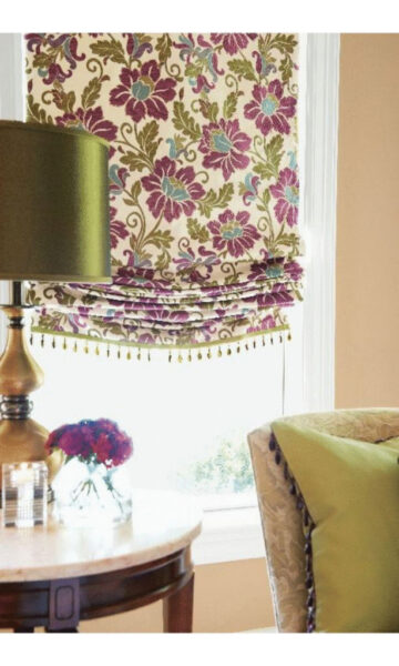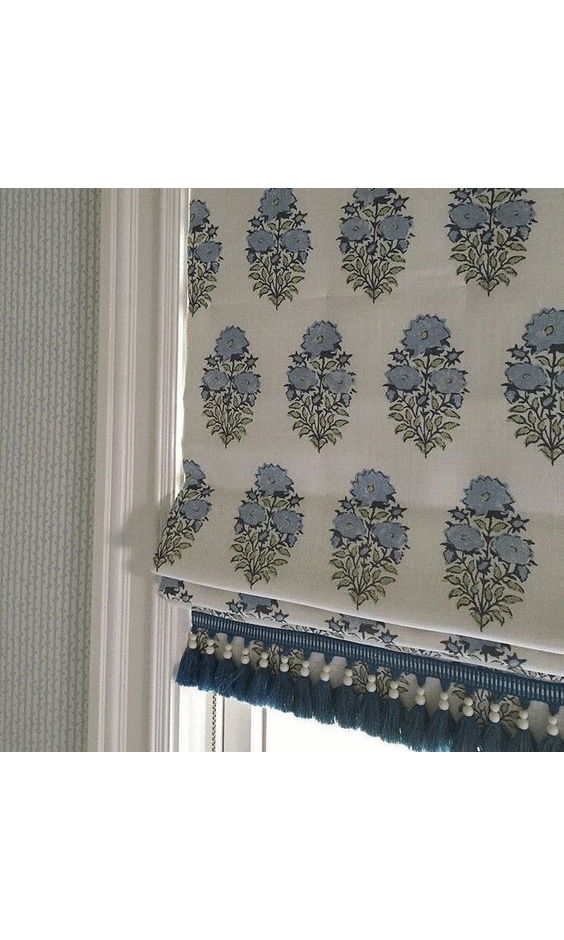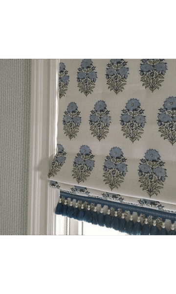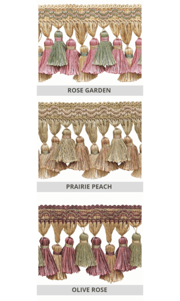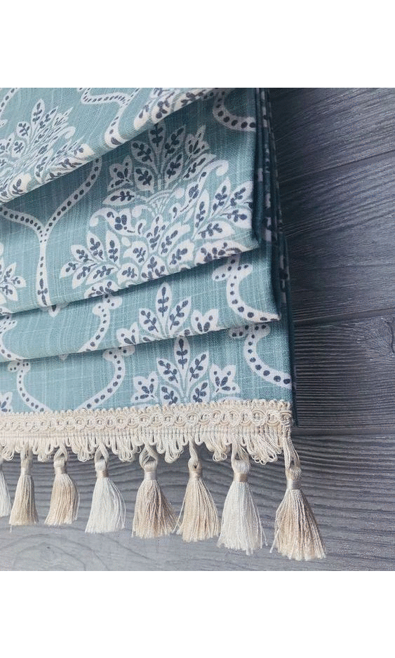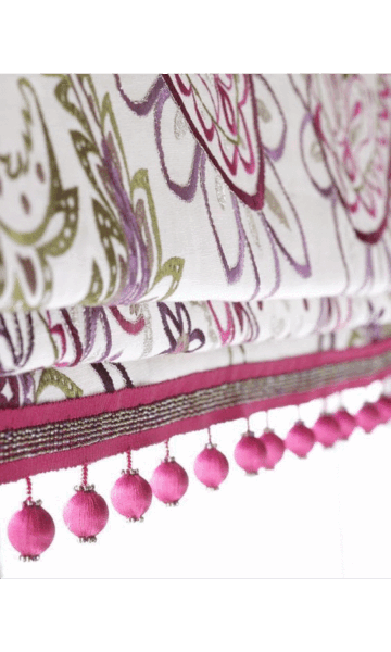 Tassel trims are handsewn on bottom hem of a roman shade.